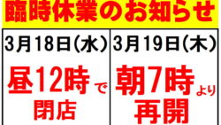 18日(水)昼12時から休業します。19日(木)朝7時から営業再開します。