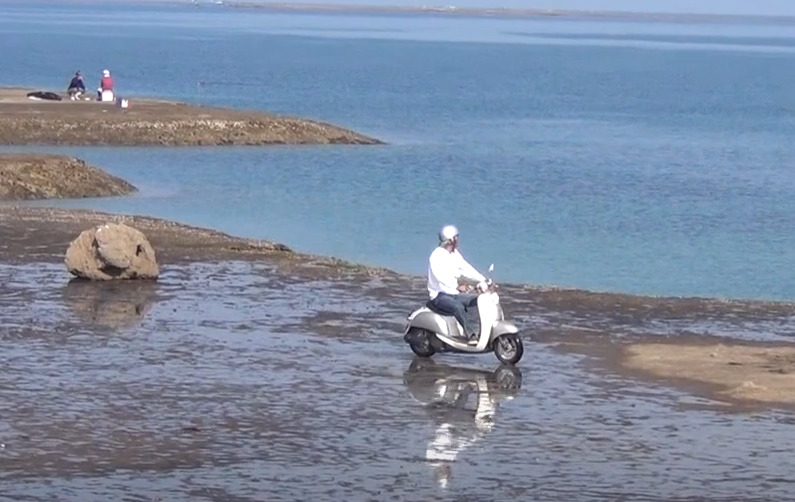 平坦で広大な為、移動を楽にしようと自転車やバイクが磯の上を走っています。