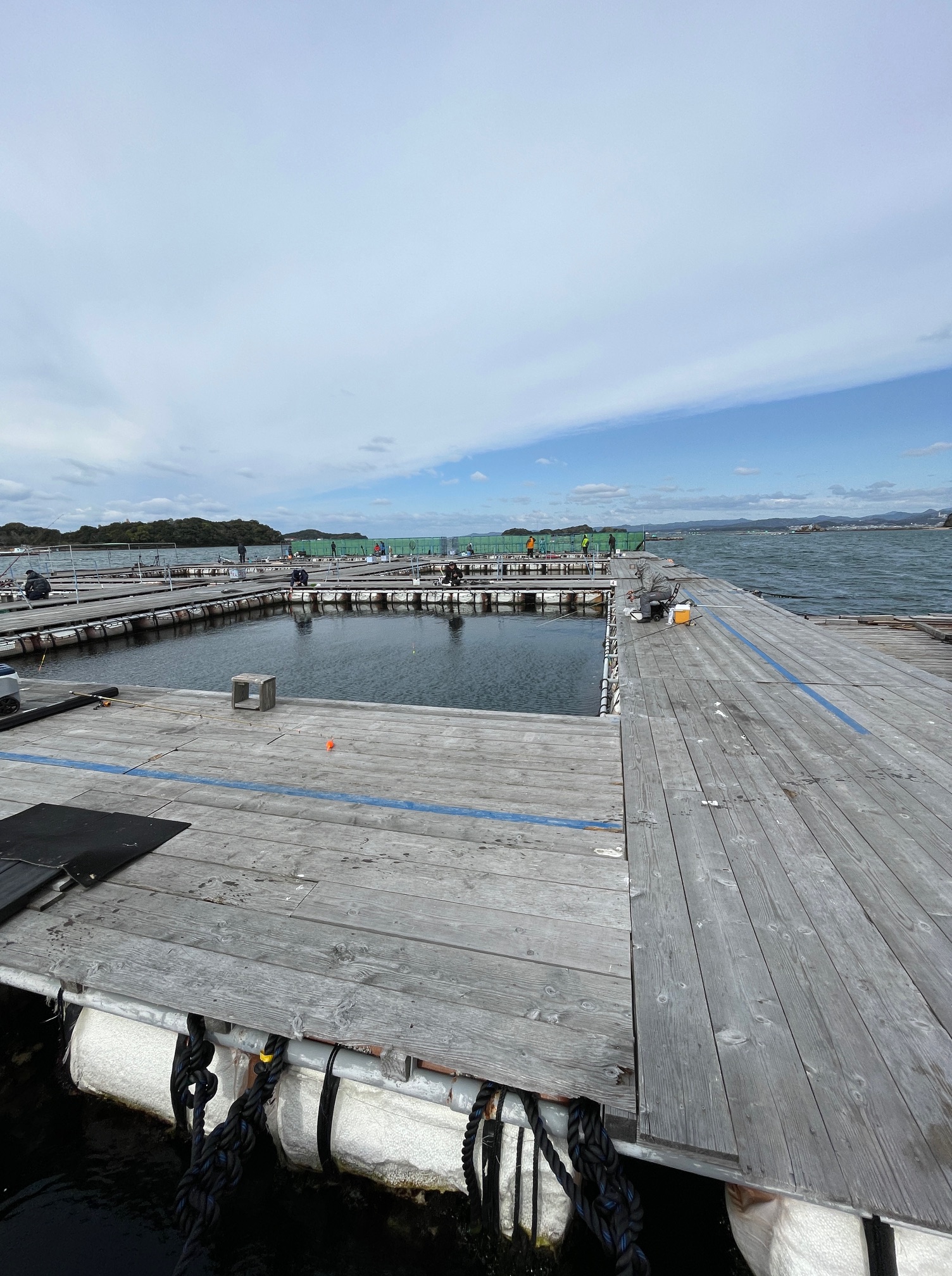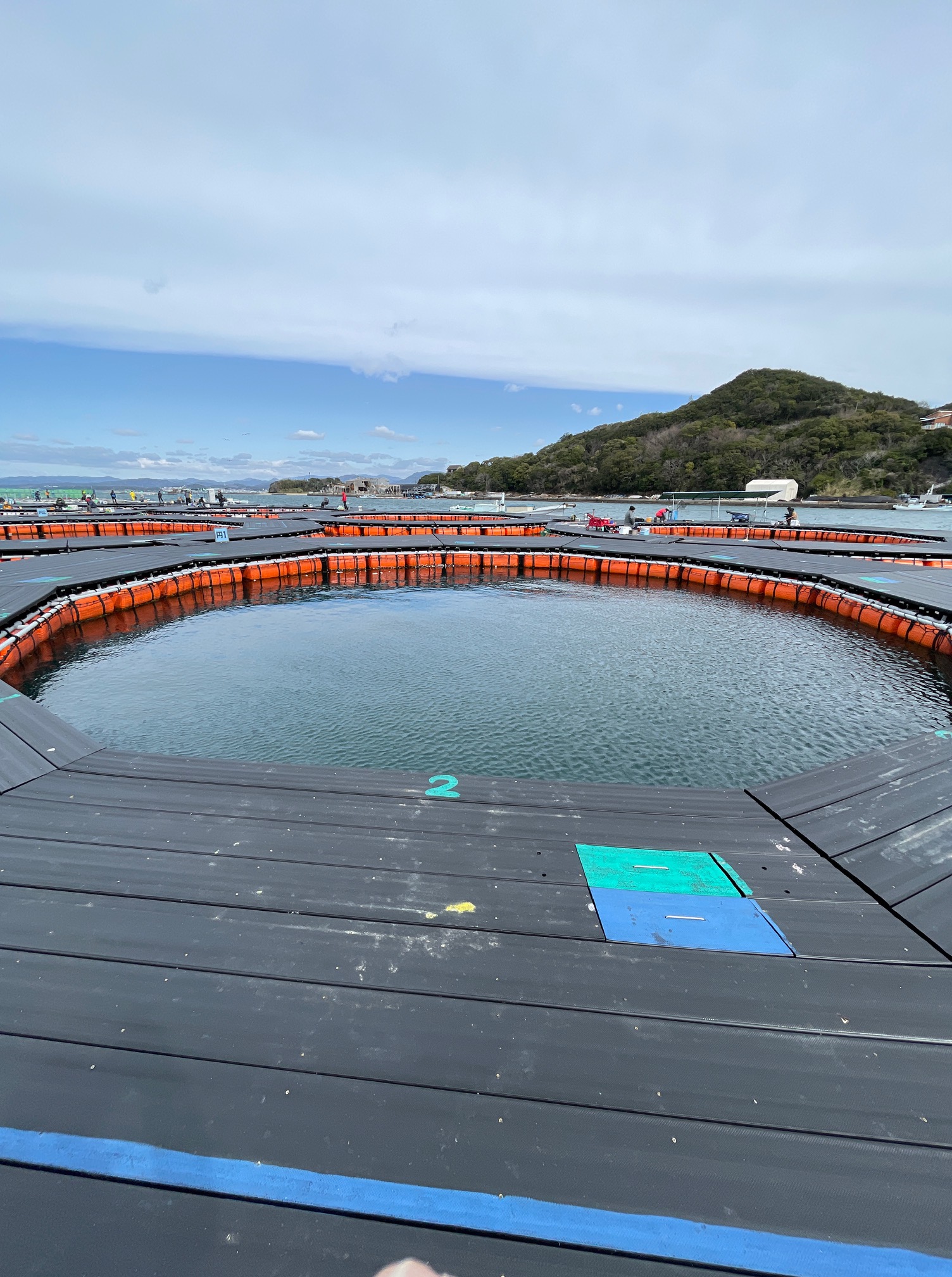 8個ある円形イケスを、渡り板に気を付けながら過ぎると
