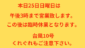 本日25日日曜日は午後3時で営業終了。この後は臨時休業となります。台風10号は非常危険なので、くれぐれもご注意下さい。