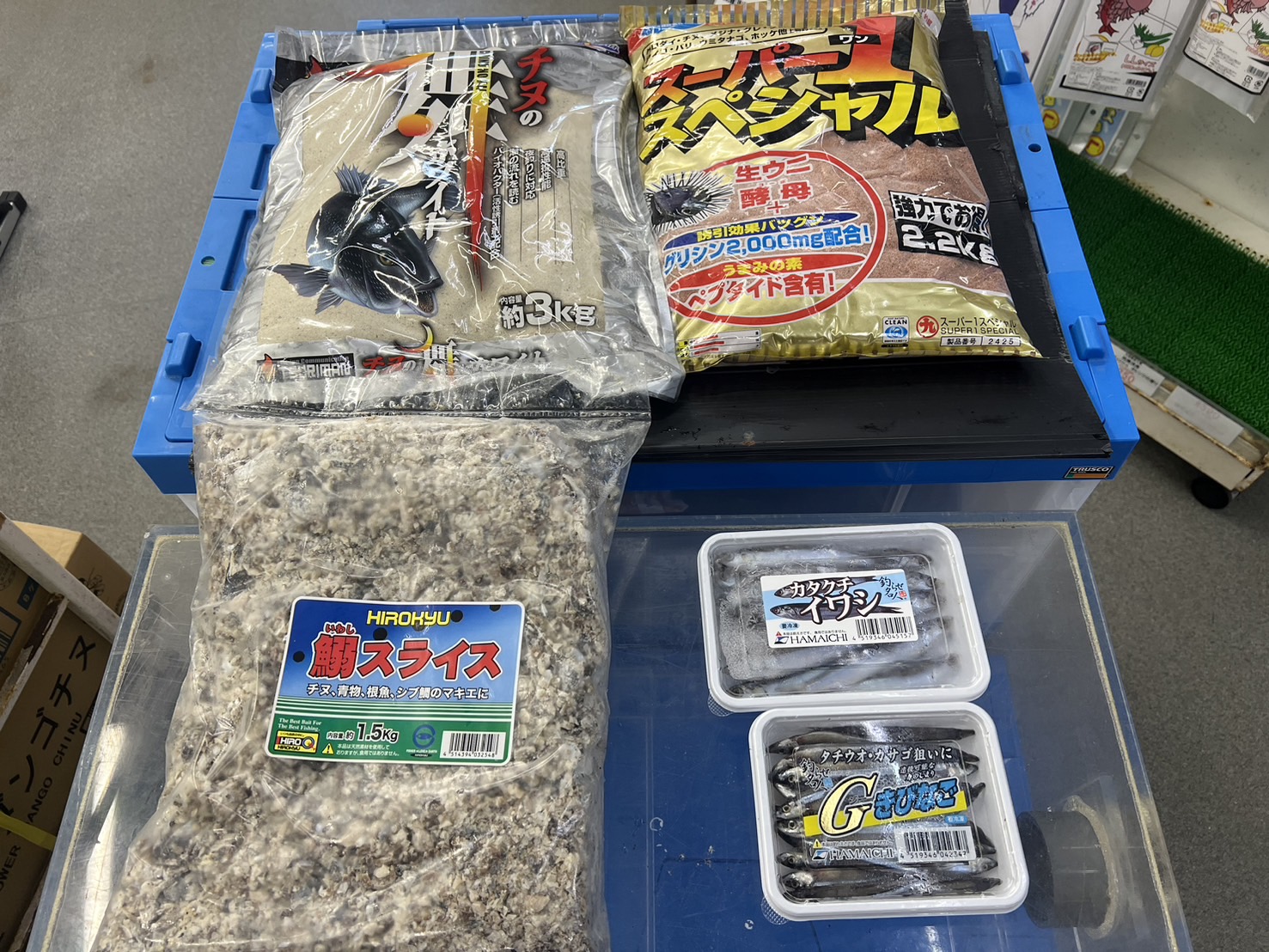 イワシスライス1.5㎏(1300円)とスーパーワンSP(680円)は匂いが強く、集魚効果抜群です。