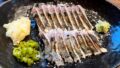天然シマアジで焼き霜造り。 生の脂のこってりさと、皮面の香ばしさがマッチした極上の逸品です!