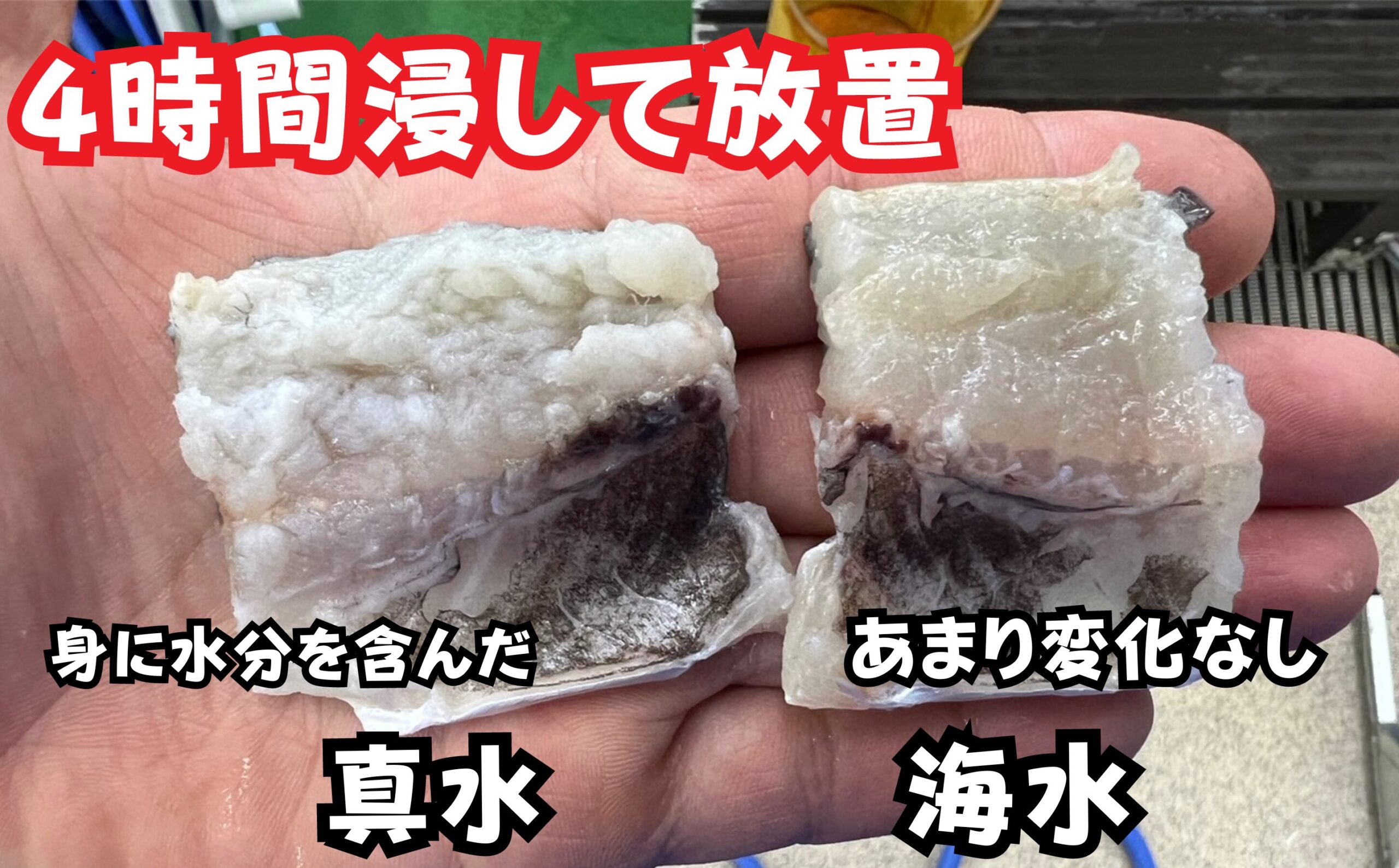 真水だと、浸透圧の関係で身に水分を含んでしまい、身が痛んで食べれなくなります。