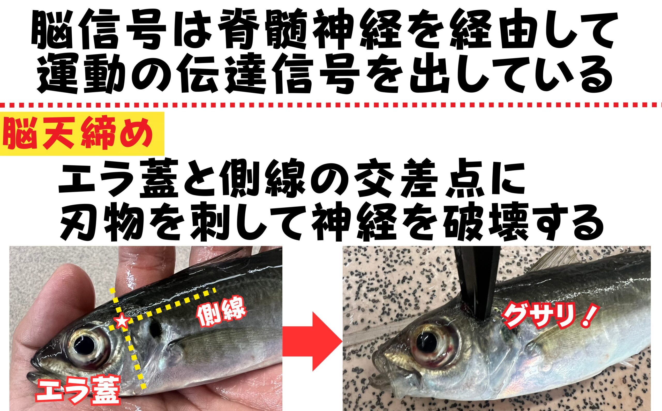 魚を締める際に、刃物を突き刺す位置は、エラ蓋と側線の交差するところを狙います。