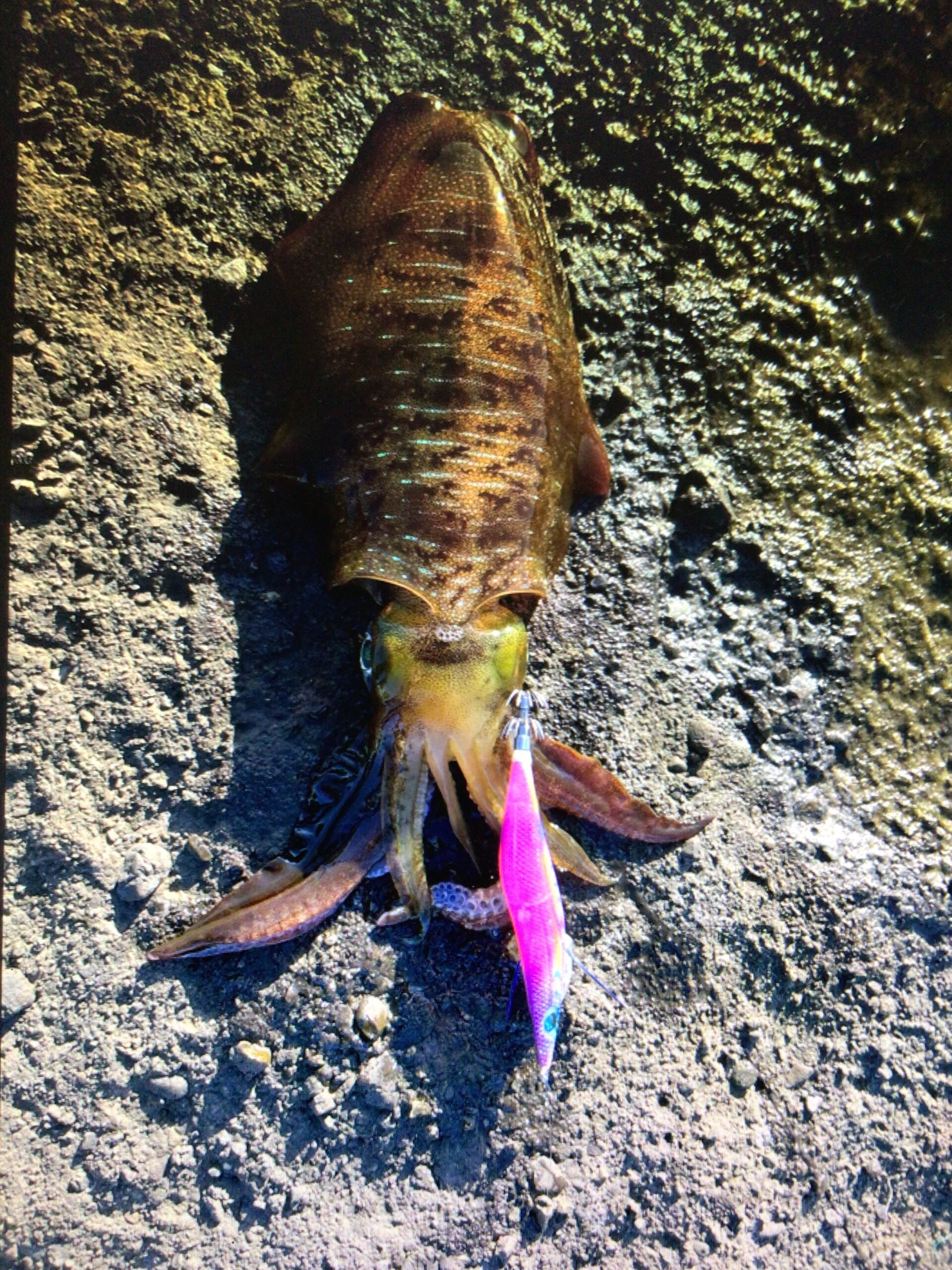のでフッキング!!!上がってきたら予想以上に大きかったです。使った餌木はエギ王の3.5号ムラ