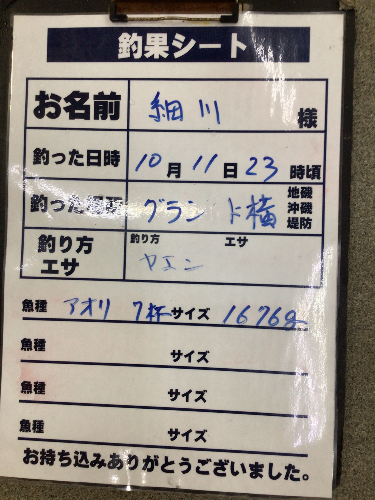 10/11  グラウンド横でアオリイカ7杯で1676g、ヤエン