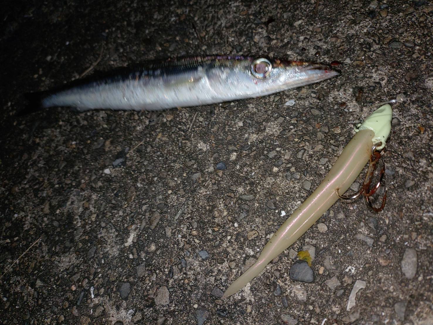 白浜太刀魚調査 スタッフ釣行記 2024.10.13 夕マズメ、タチウオ調査に出かけました。 ワインドで狙ってみるが無反応。 30分ほど粘るが… すると、何かが喰ってきた。何ぃ?小さい? カマスやん。 連発もせず終了。