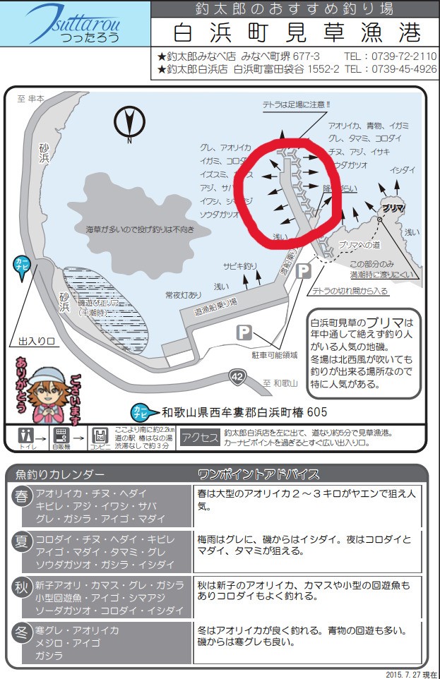 見草(みぐさ)漁港・地磯ブリマ 釣太郎白浜店から車で5分ほどの位置にあり、車を止めるスペースは広く横付けも可能。海面との高低差も少ないのでビギナーさんでも安心。サビキ仕掛けではイワシ、小サバ、日によって豆アジなども釣れます。その他にもアオリ