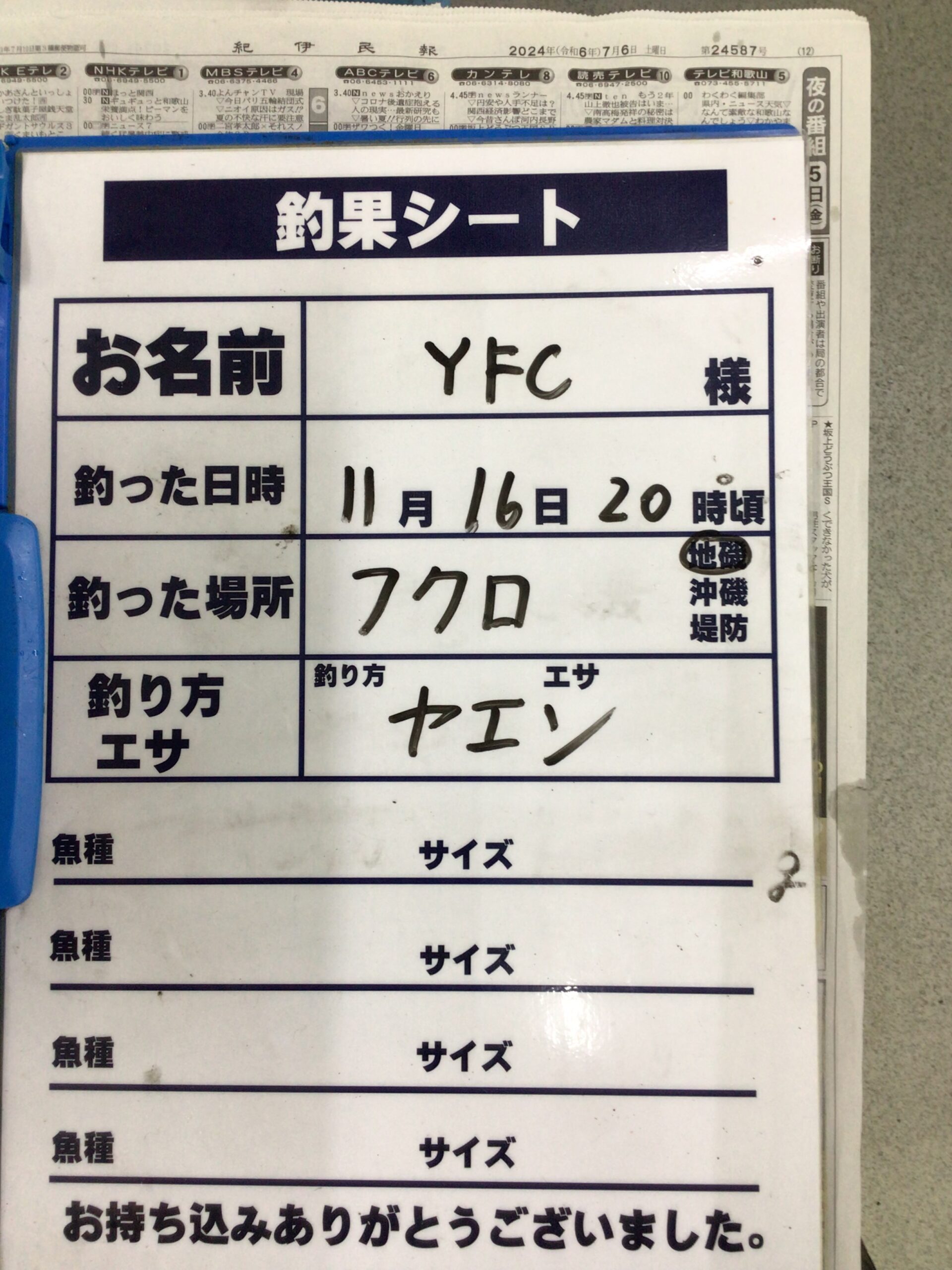 11/16(土)袋地磯にてアオリイカ2杯、ヤエン釣りの持ち込み釣果