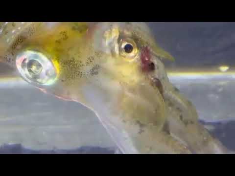 「イカの王様」アオリイカがアジを食べている映像。みなべ店で展示飼育しています。