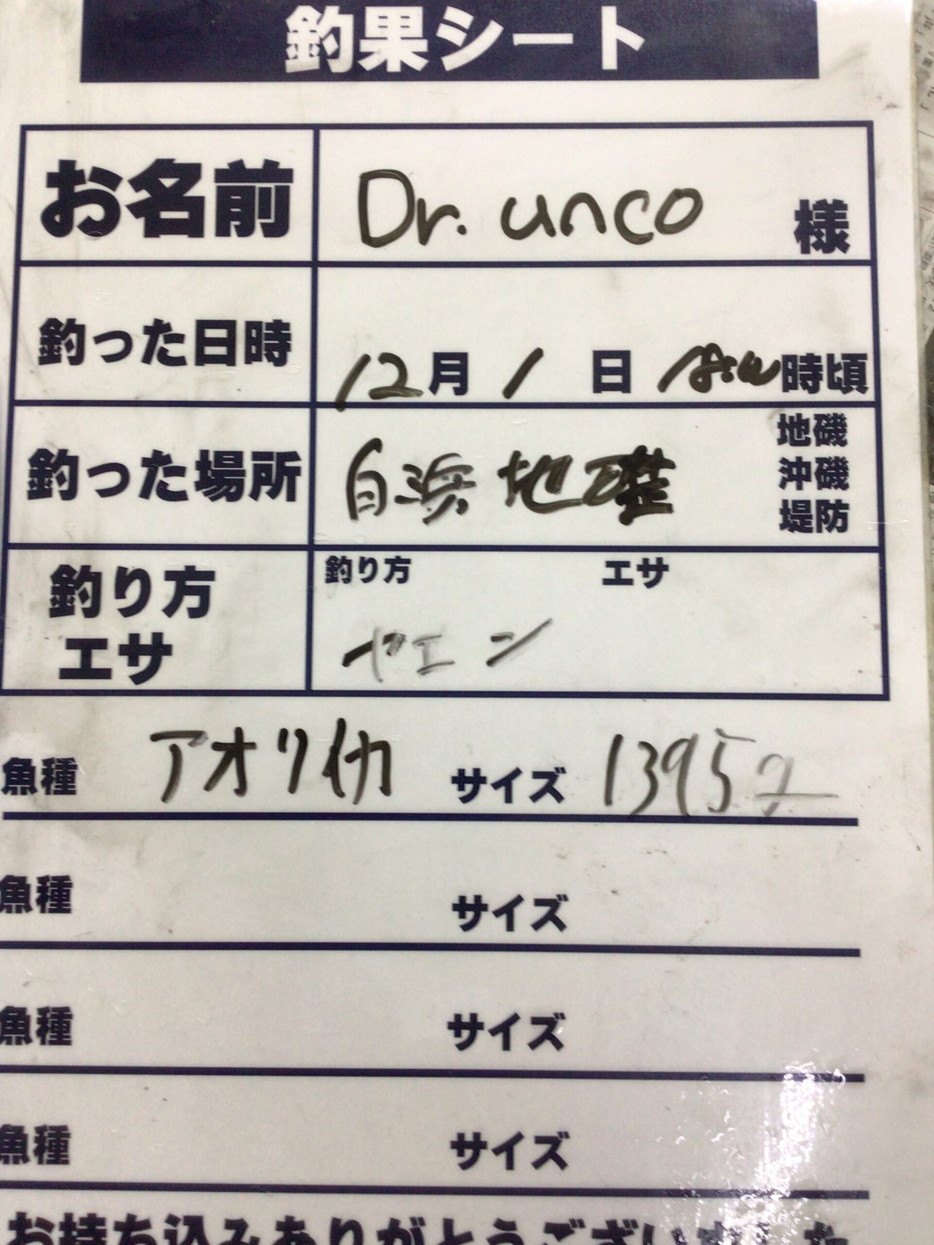 12/1 白浜地磯にてアオリイカ1395g上がってます