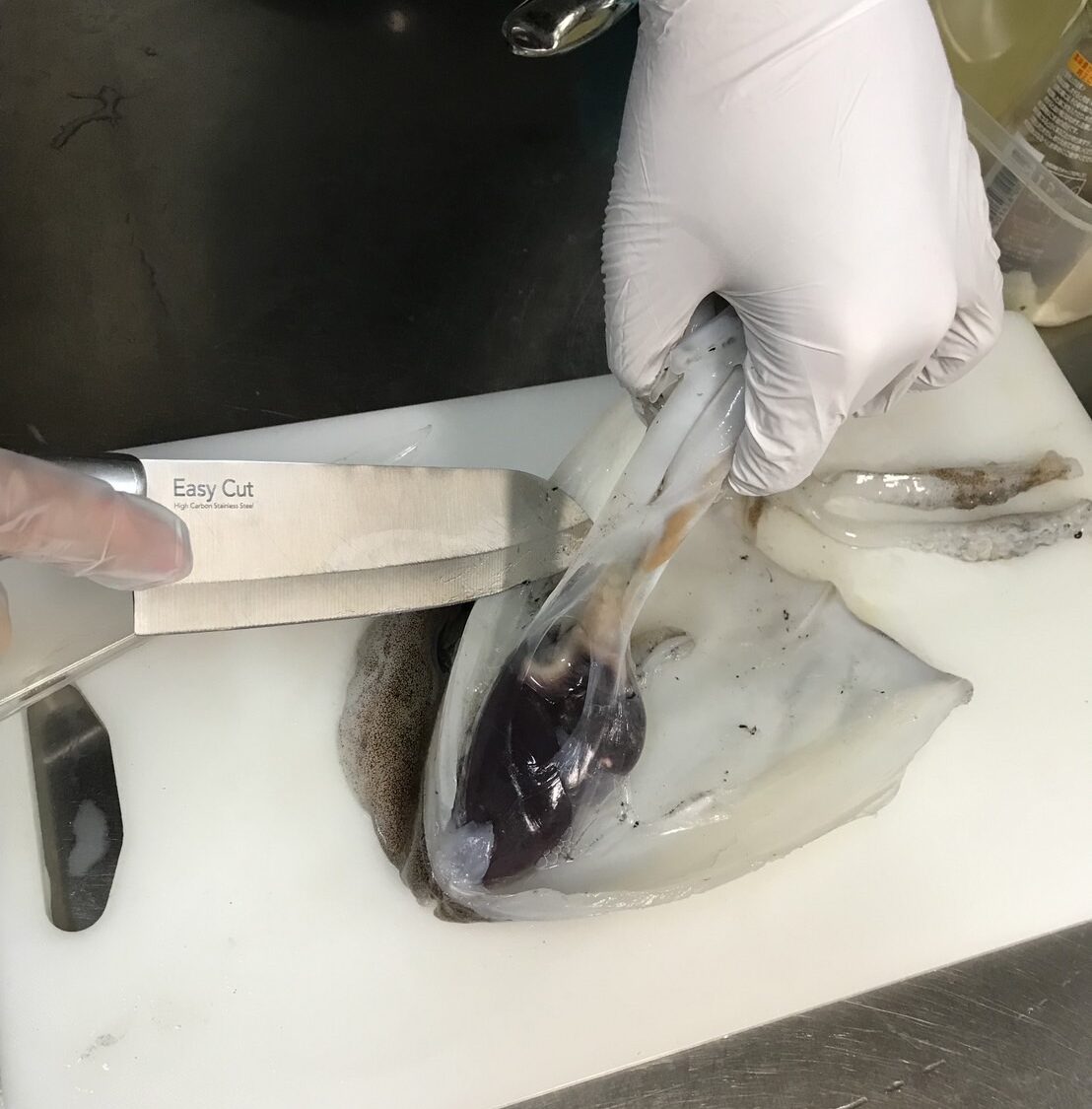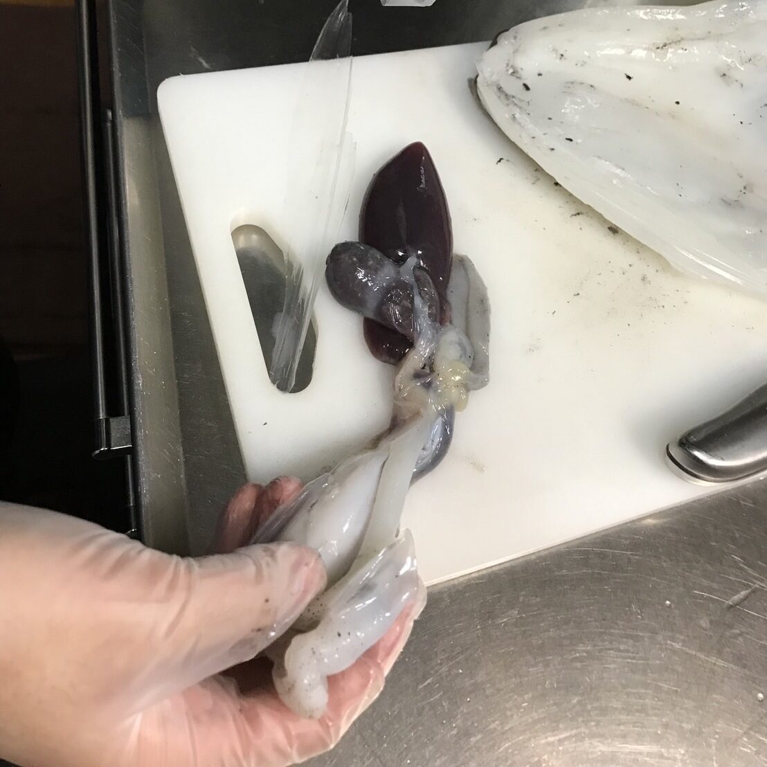 墨がたくさん溜まってますね。墨袋を破ってしまうとまな板が大変なことになりそうなので気を付けて取り出していきます。
