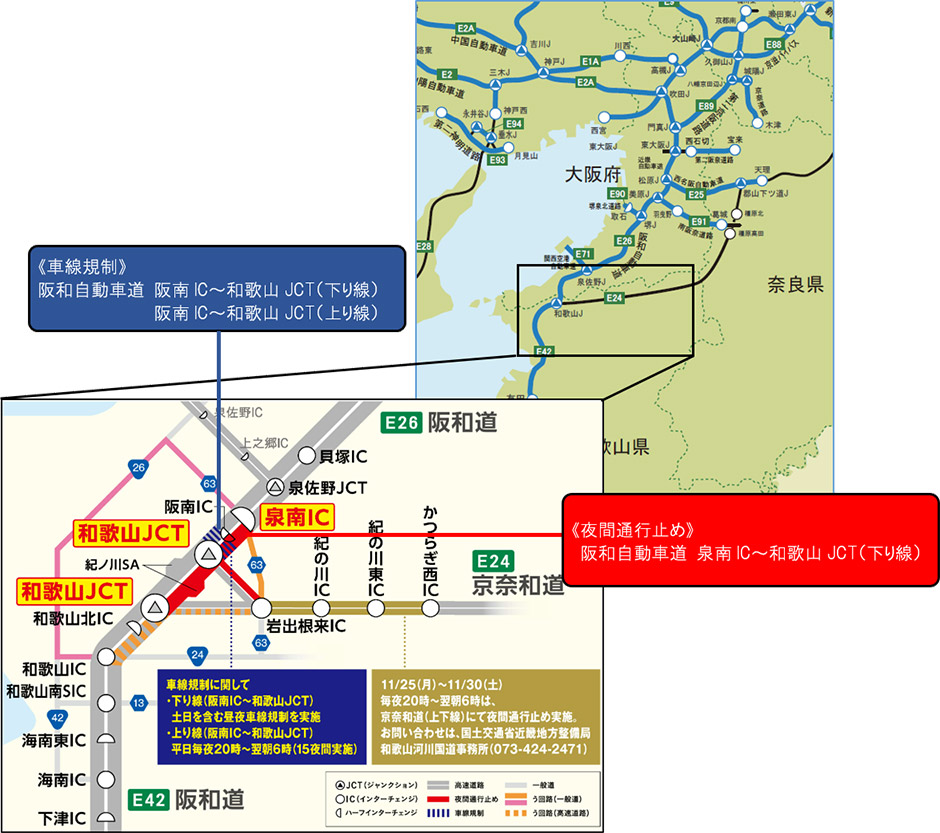 阪和道夜間通行止めのお知らせ お知らせ 2024.12.08 12月14日(土曜)朝まで(15夜間) 時間帯毎夜20時~翌6時 詳細はこちら E26 阪和自動車道 泉南IC~和歌山JCT(下り線)で夜間通行止め等を実施します | NEXCO 西日本 企業情報NEXCO西日本関西支社は、高速道路リニューアルプロジェクトとして、E26 阪和自動車道泉南IC~和歌山JCT間において、橋梁更新工事のため夜間通行止めを実施します。