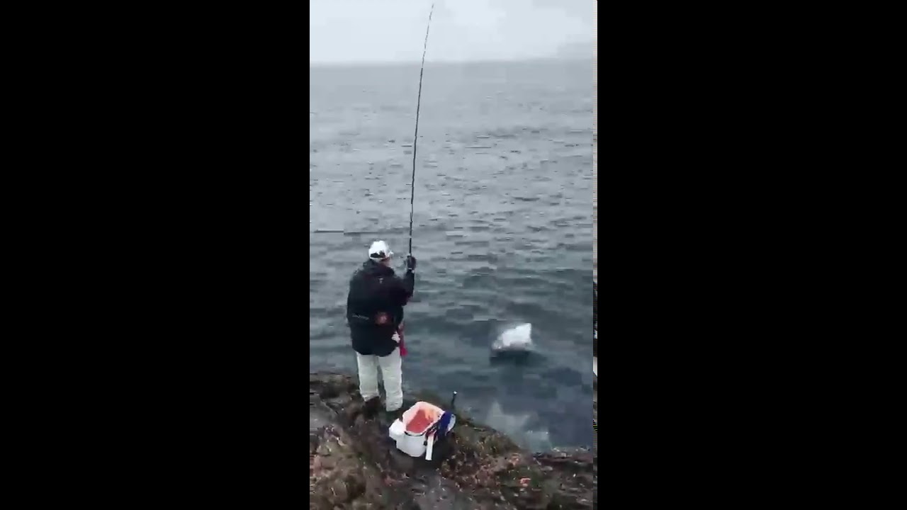 ふかせで釣った魚にサメが襲い掛かる映像。