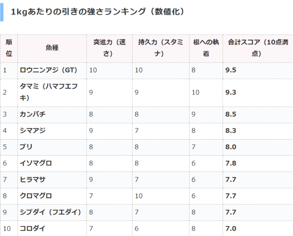| 順位 | 魚種 | 突進力(速さ) | 持久力(スタミナ) | 根への執着 | 合計スコア(10点満点) |