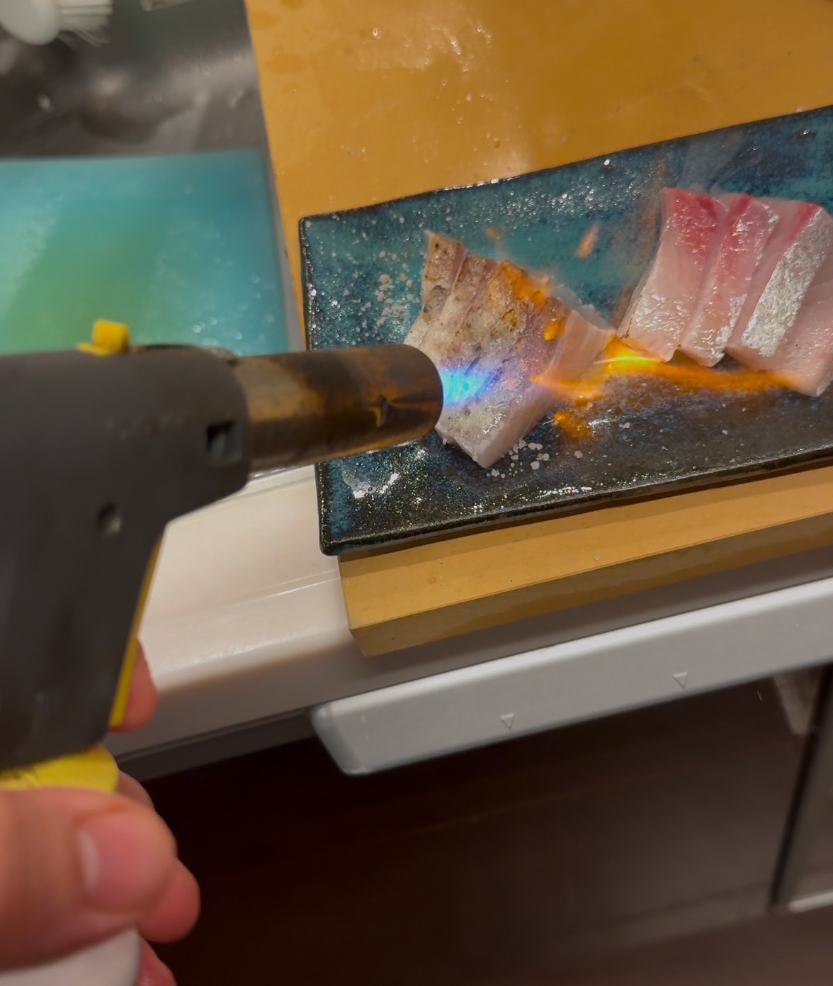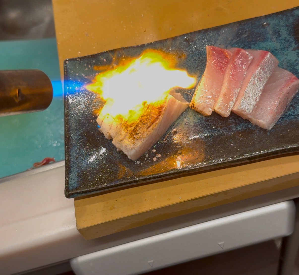カンパチは皮が分厚いのでしっかりと炙る必要があります。