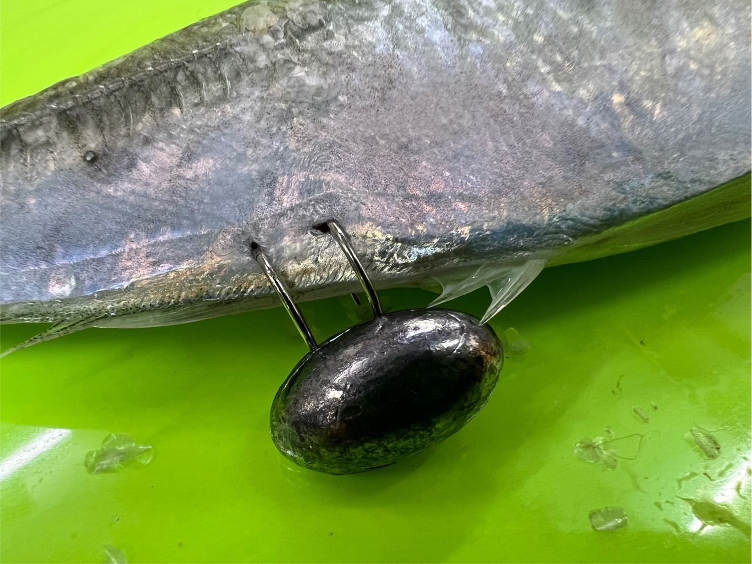 鯵の腹部にオモリを装着するだけで簡単に準備完了。特別な工具や技術は必要ありません。 - 鯵を投入しアオリイカを待つ