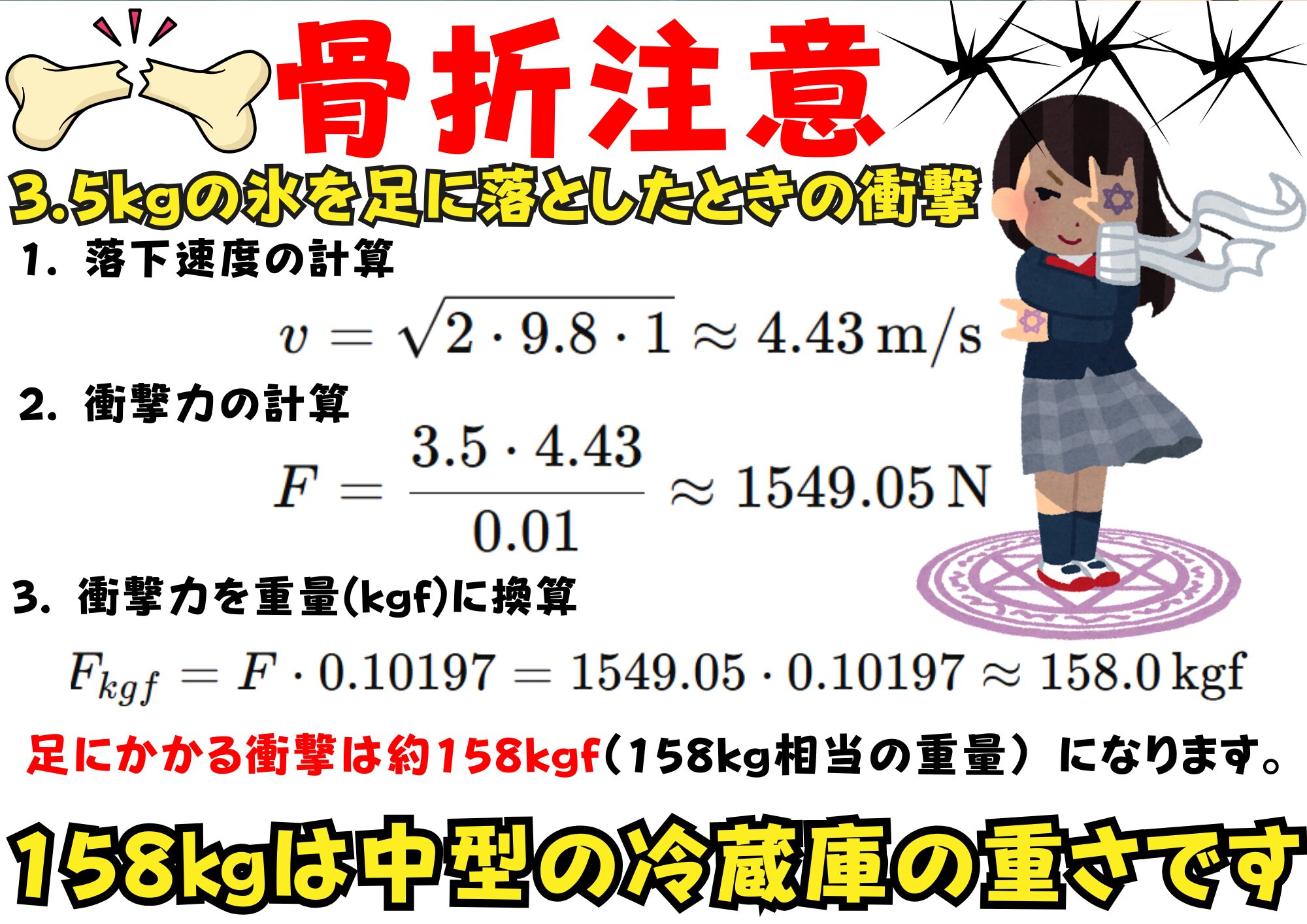 例えば、この3.5kgの氷を誤って足に落としてしまった場合、大きな衝撃が発生します。物理計算によると、この氷が1メートルの高さから落下した場合、足にかかる衝撃はなんと約158kg(中型冷蔵庫と同等の重さ)にもなります!この衝撃は骨折のリスクを伴うほどの大きさです。