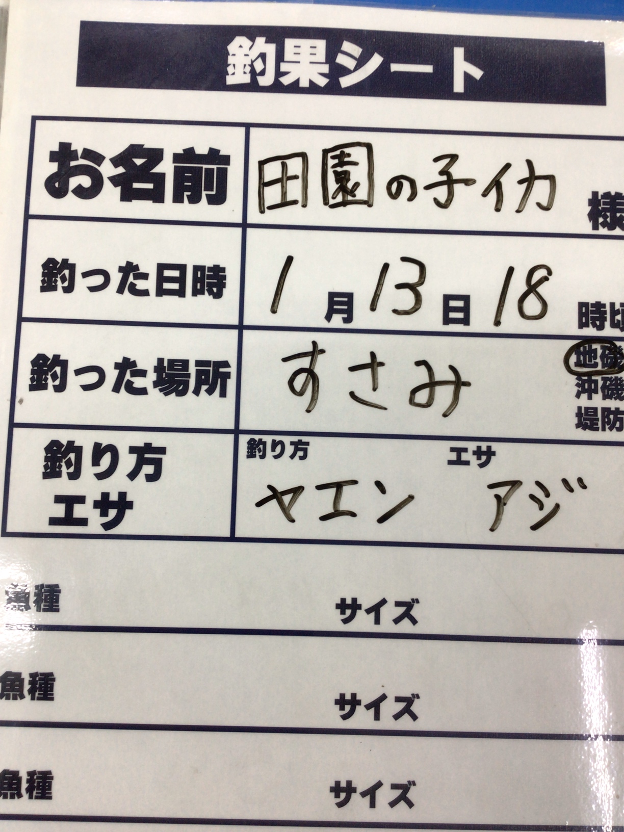 1/13 (月) すさみ地磯にてアオリイカ~1555g計5杯5195g ヤエン釣りにて