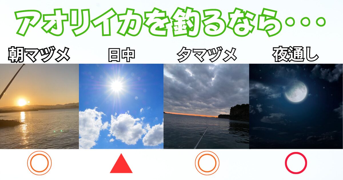 朝マズメと同様に、日中深場にいたイカが捕食のため浅瀬にさしてくる時間帯です。大型のイカも活発にアジに食らいついてくるため、釣果を上げるには最適な時間帯です。釣れるサイズは小さいものから大きいものまで様々で、深場から上がってきた【移動性】のイカが多いと考えられます。