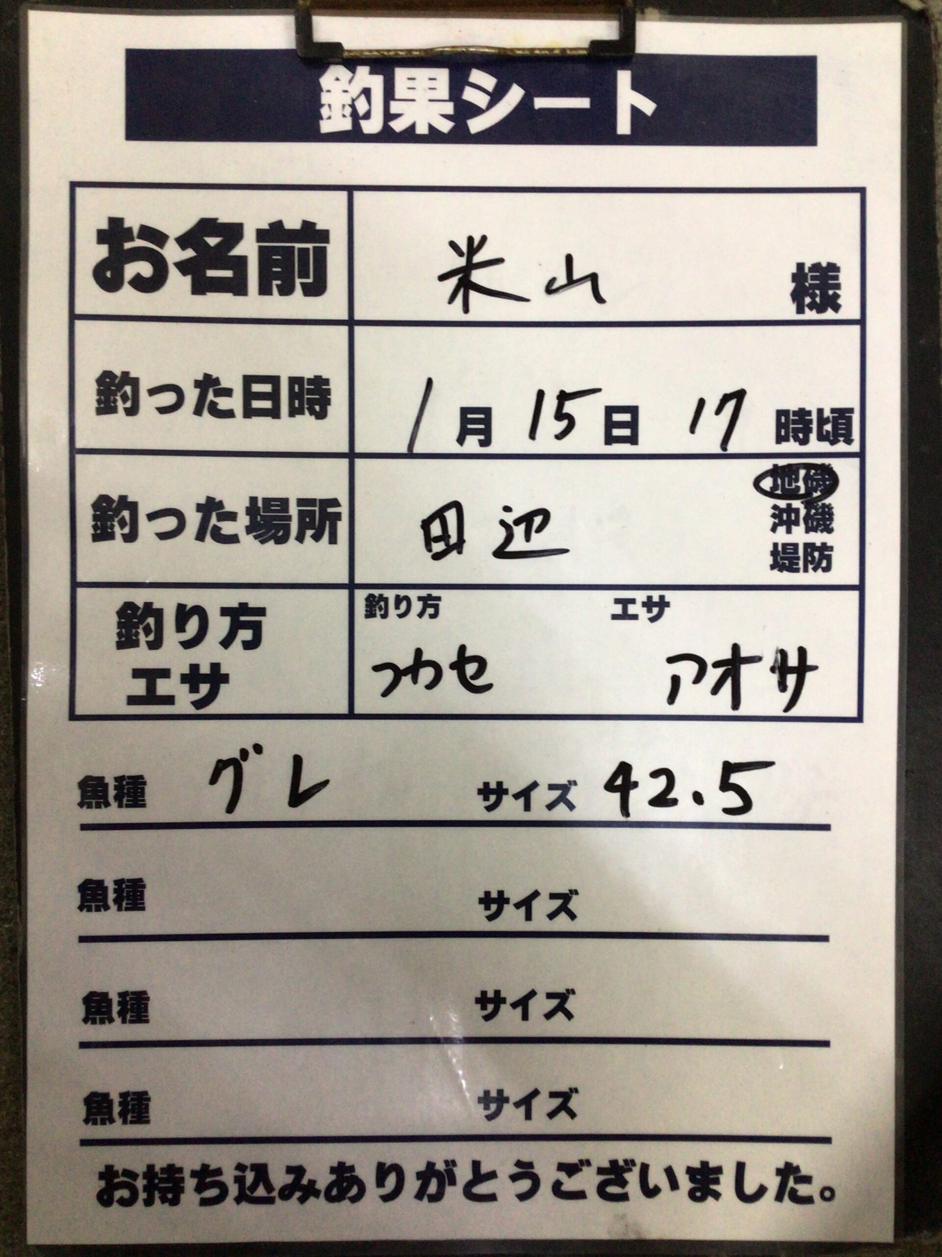 1/15 田辺地磯でグレ42.5㎝の釣果