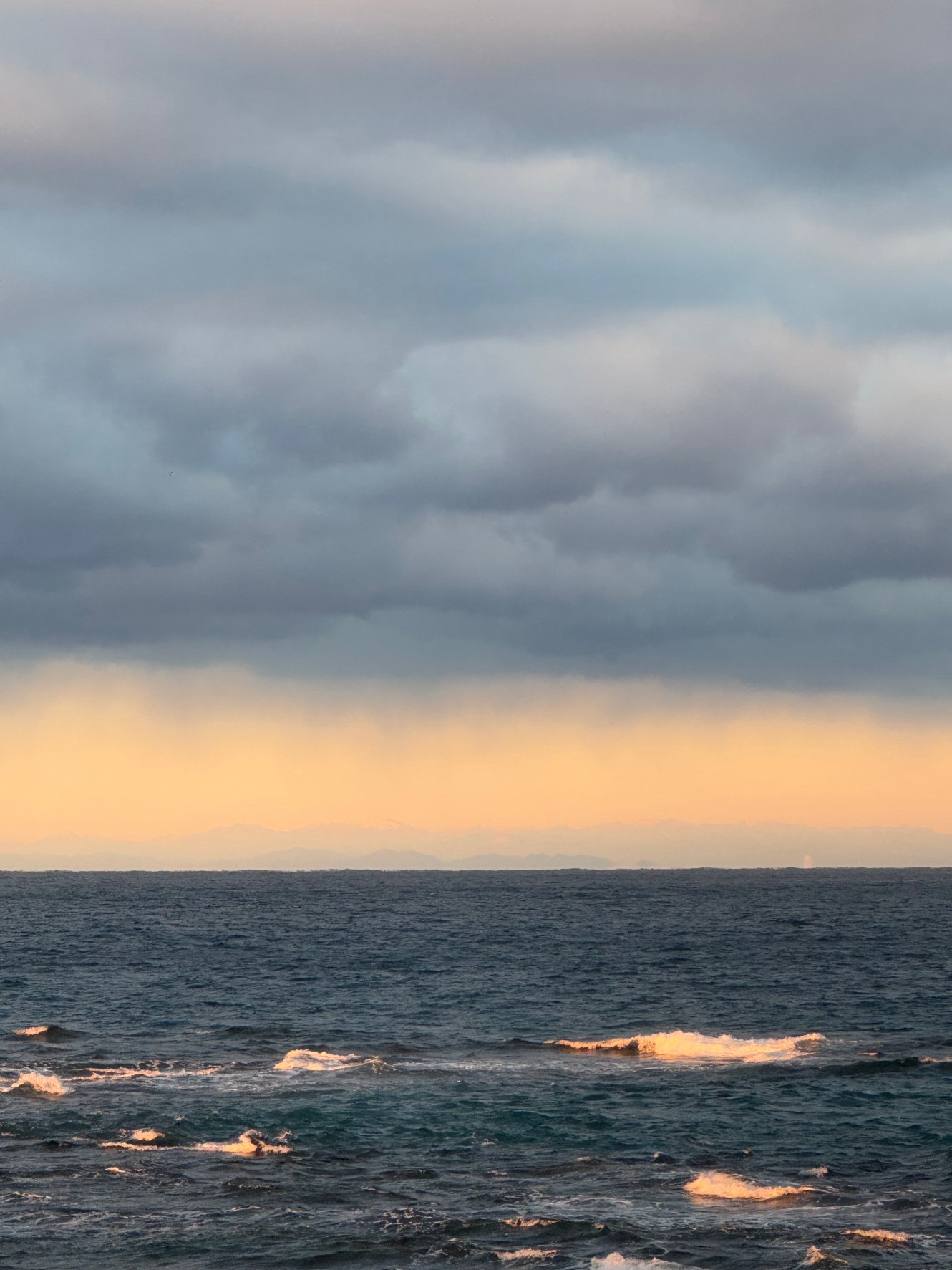 - 空と海の冷たいトーンに対し、遠くにかすかに暖かみを感じる光が映えており、寒さの中にも美しさがあります。この光は太陽の低い位置からの反射光と思われます。