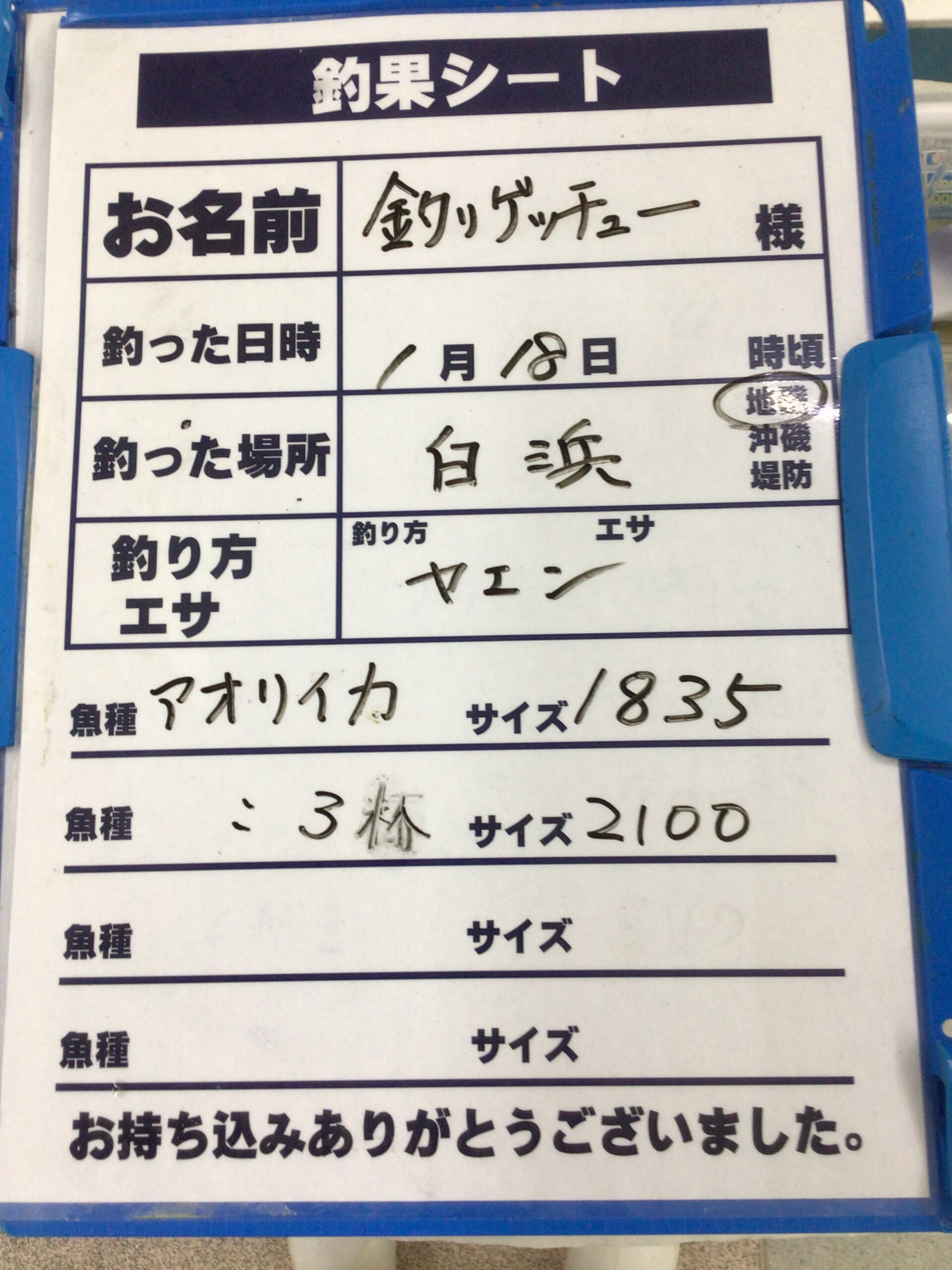 1/18 白浜町地磯にてアオリイカ4杯の釣果 最大2100g! ヤエン釣り