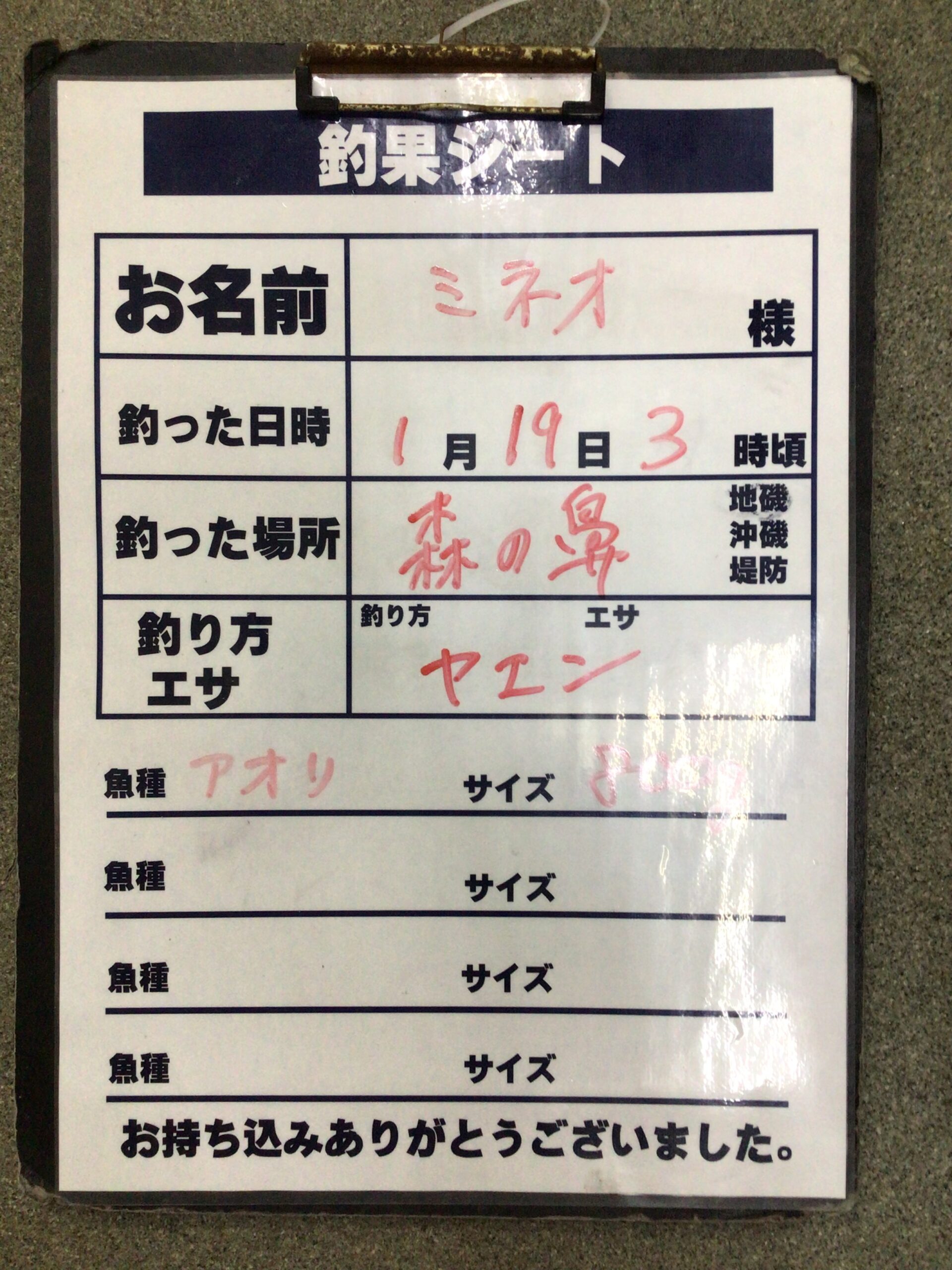 1月19日 ミネオ様 アオリイカの釣果。 みなべ町森の鼻800g