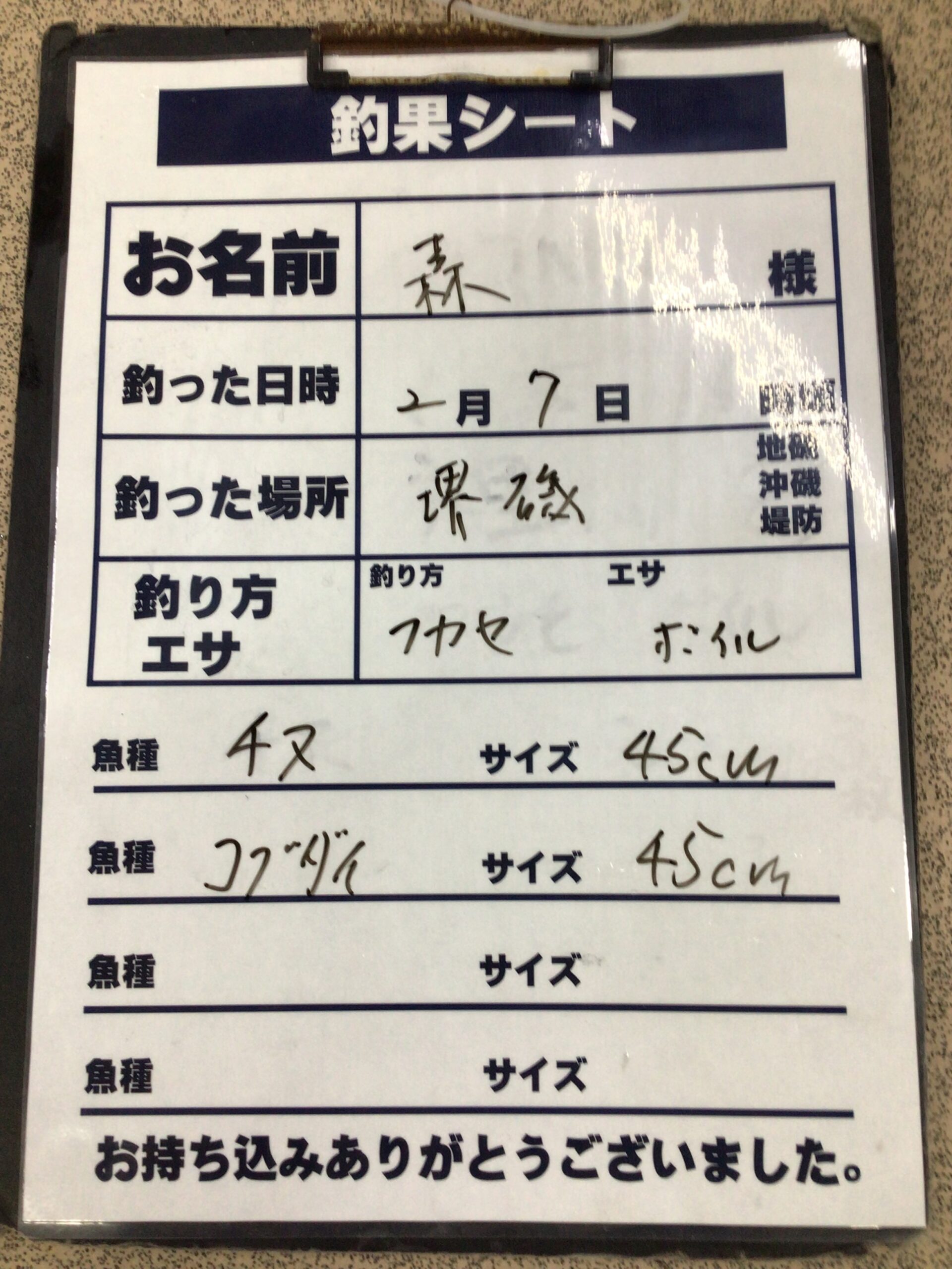 2/7 みなべ堺磯にてチヌ45cmカンダイ45cm上がってます