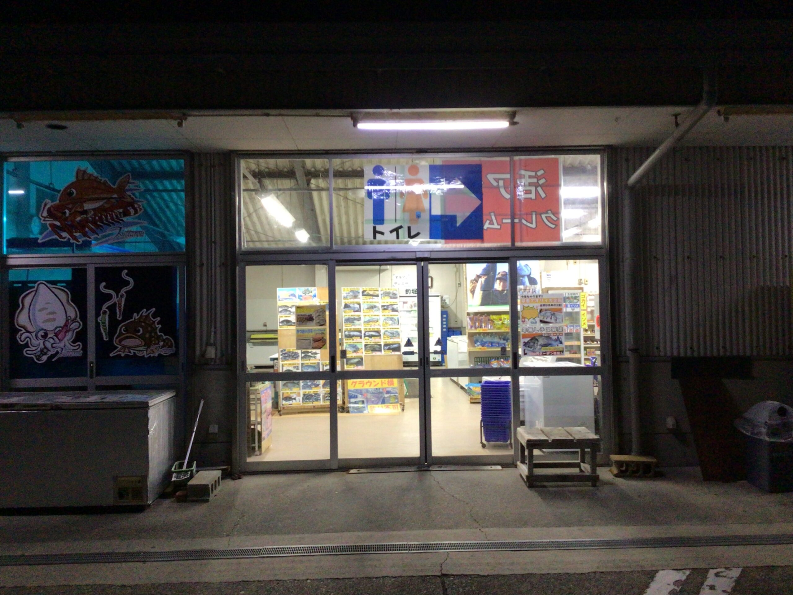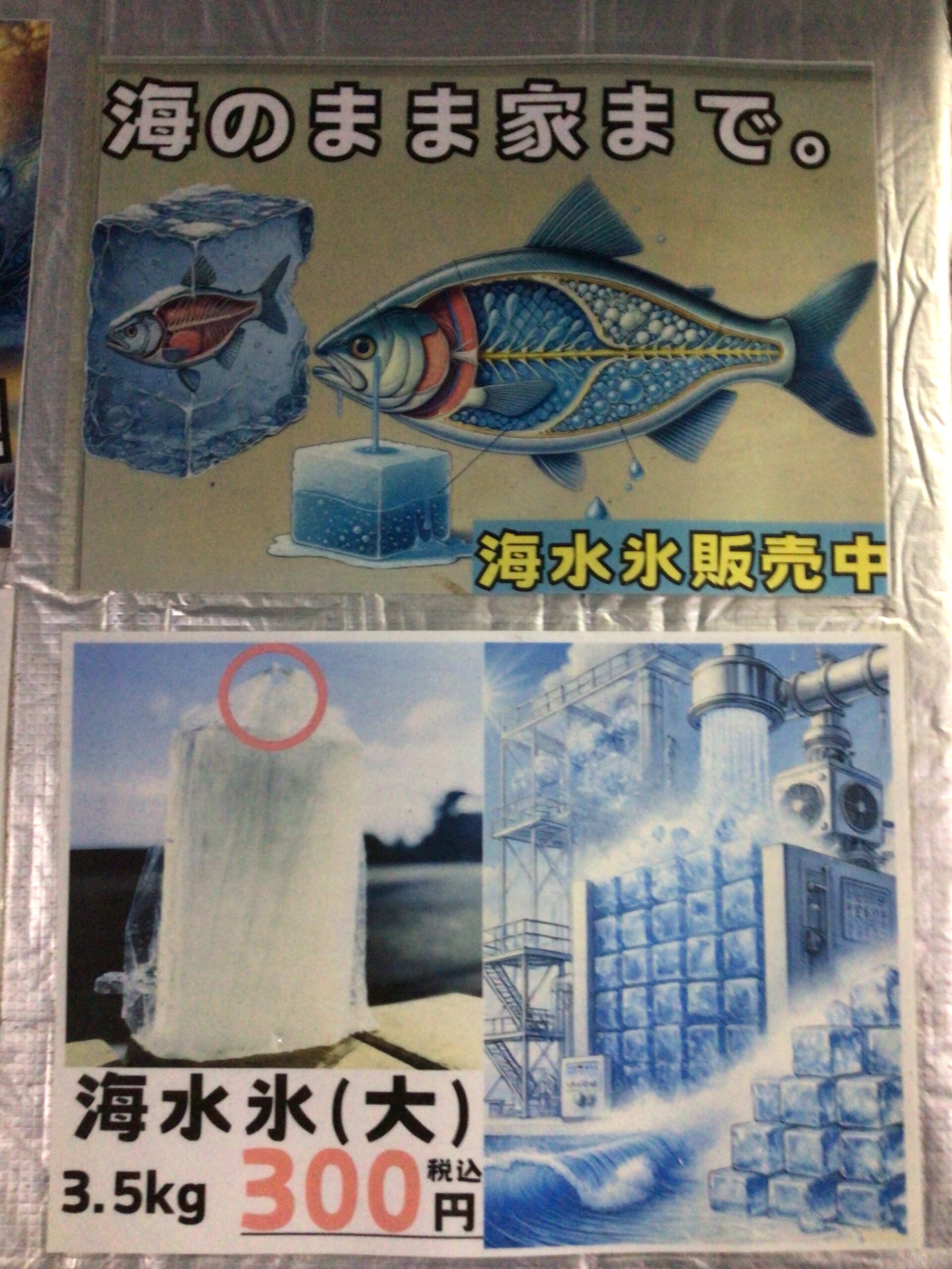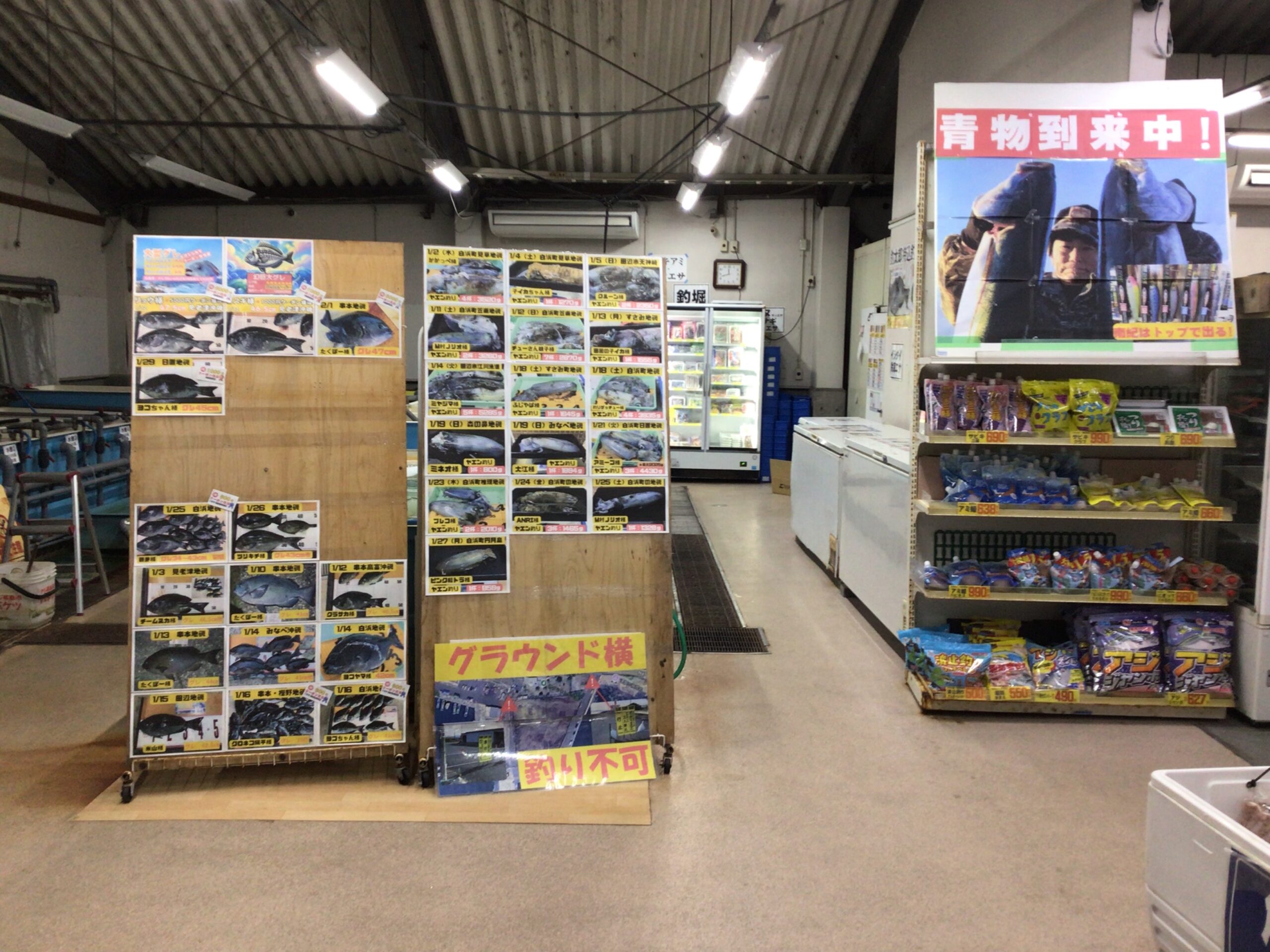 出入り口となります。中に張り出してある物が気になりますが先に左のストッカーをご紹介。釣った魚の鮮度を保つのに必要不可欠な物それは扇風機・・・ではなくて氷です。当店では様々な形状・サイズの氷を取り扱っております。中でもなかなか他店では販売しておらず尚且つ魚に優しい海水で作った【海水氷】を取り扱っております。海水氷ってどんなのと思ったら釣太郎ブログにて検索してみてね。