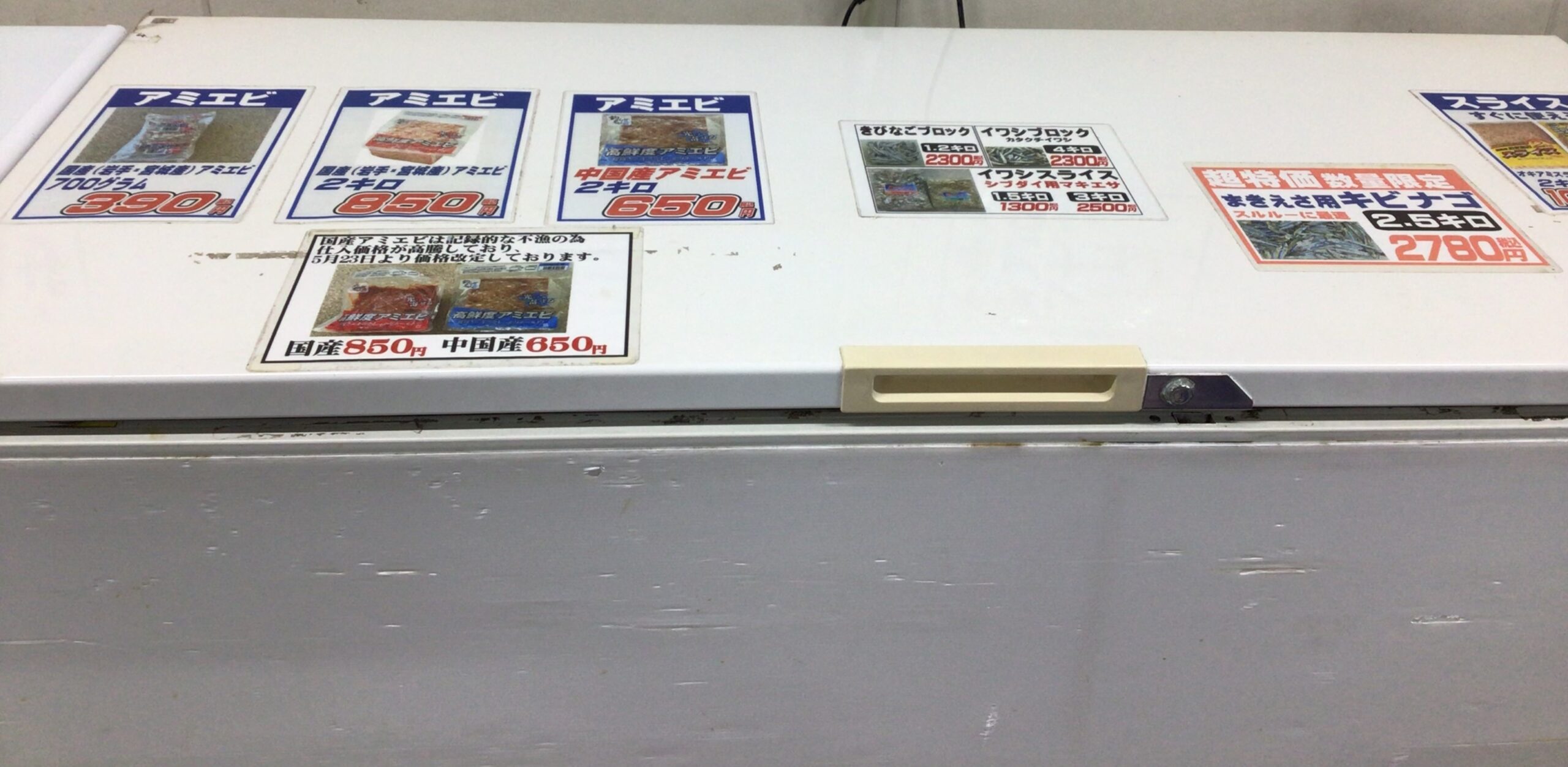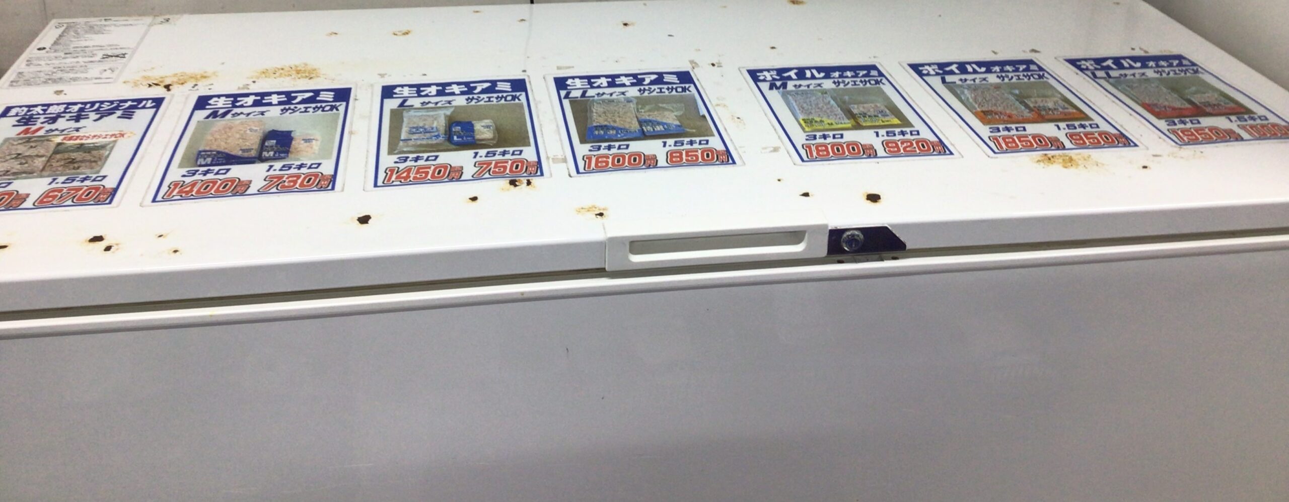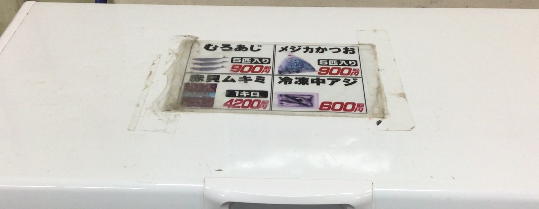 出入り口となります。中に張り出してある物が気になりますが先に左のストッカーをご紹介。釣った魚の鮮度を保つのに必要不可欠な物それは扇風機・・・ではなくて氷です。当店では様々な形状・サイズの氷を取り扱っております。中でもなかなか他店では販売しておらず尚且つ魚に優しい海水で作った【海水氷】を取り扱っております。海水氷ってどんなのと思ったら釣太郎ブログにて検索してみてね。