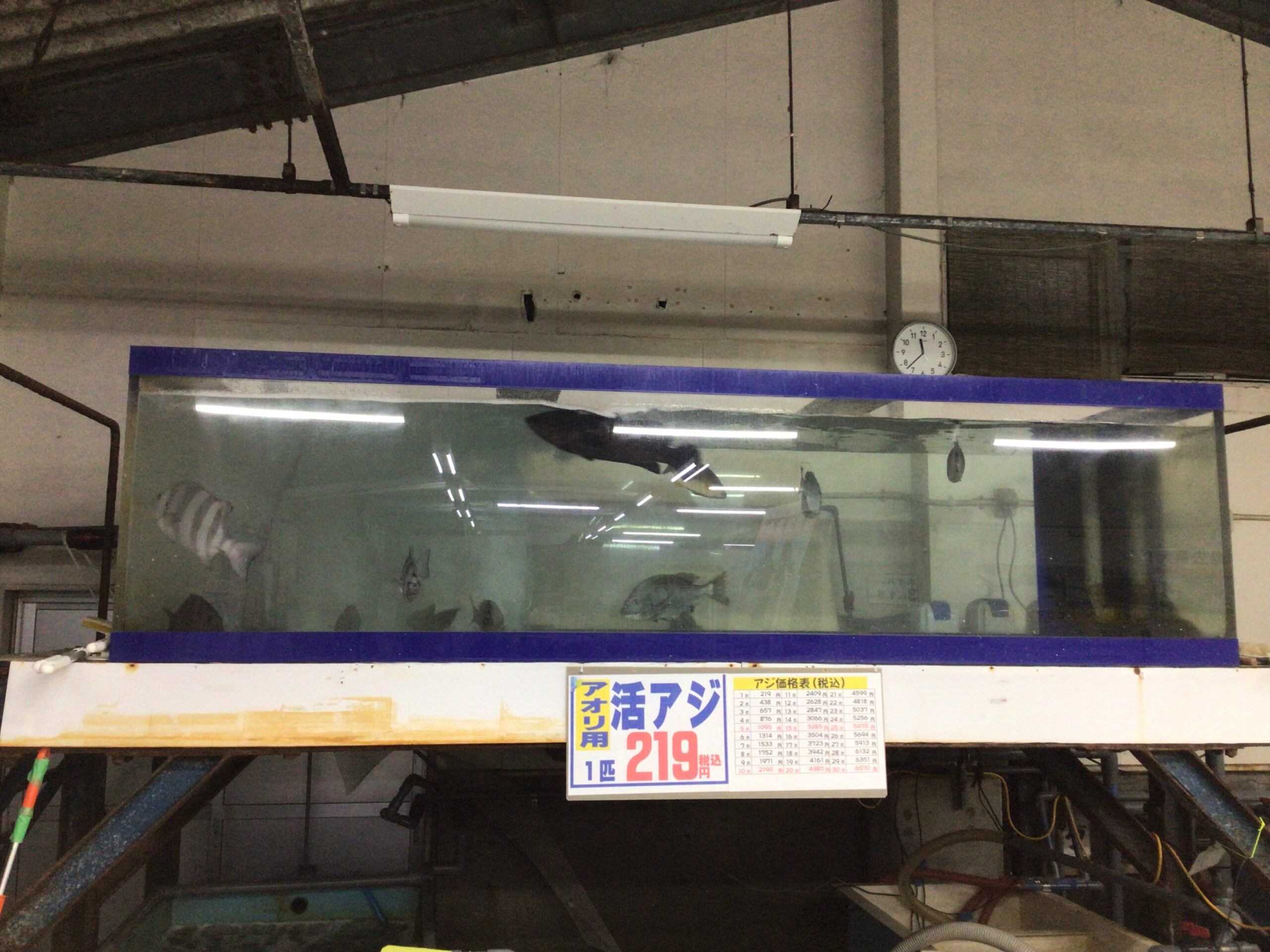 そして南紀と言えばアオリイカ アオリイカと言えばアジ アジと言えば釣太郎と思われるほど大量のアジを泳がせている大水槽。ご入店の際には足を止めて一度は見てみたくなるほどの迫力!!よく目を凝らして見てみるとアジじゃない魚も泳いでいるかも!?
