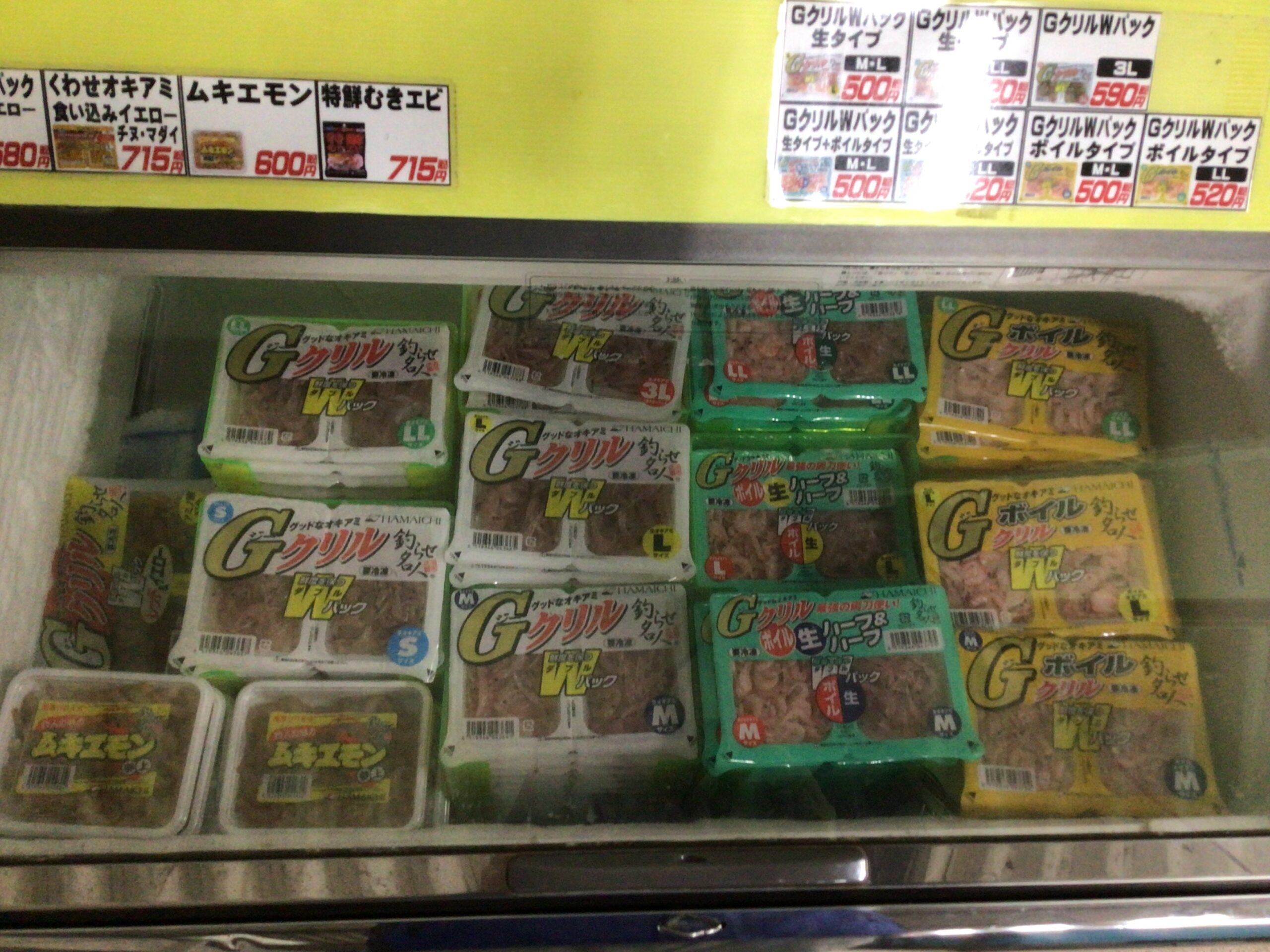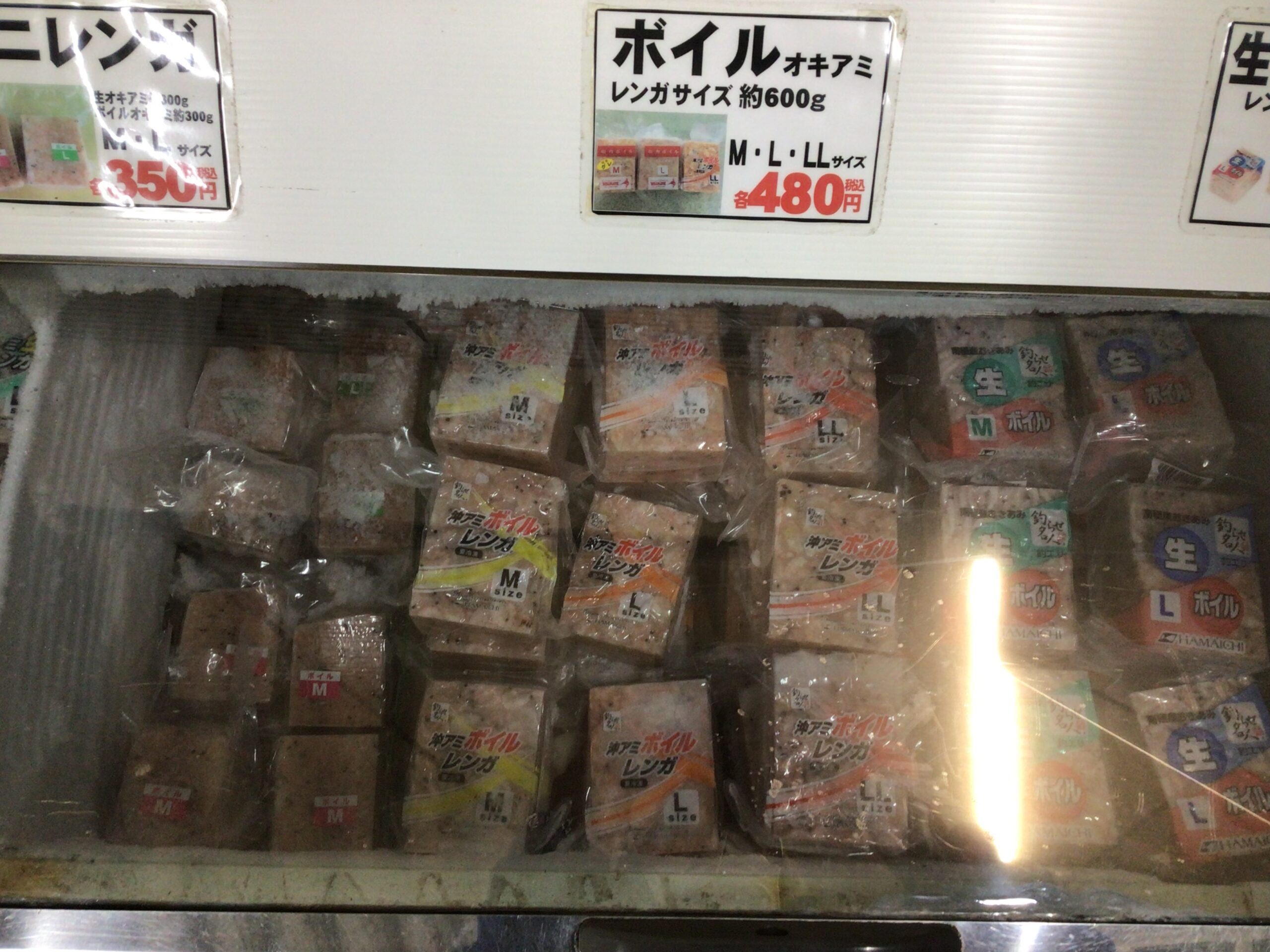 一番奥にございますストッカーはサシエサコーナーとなっておりオキアミの加工されたもの 生 ボイル等取り揃えてございます。サシエサとは釣り針にさすエサのことです。各メーカーより厳選されたものをご用意しております。簡単に作ってみたい方は【週末店員のマキ餌こだわり】をブログでチェック。他店ではなかなかみられない冷凍ウニなどございますのでぜひぜひ使ってみて下さい。