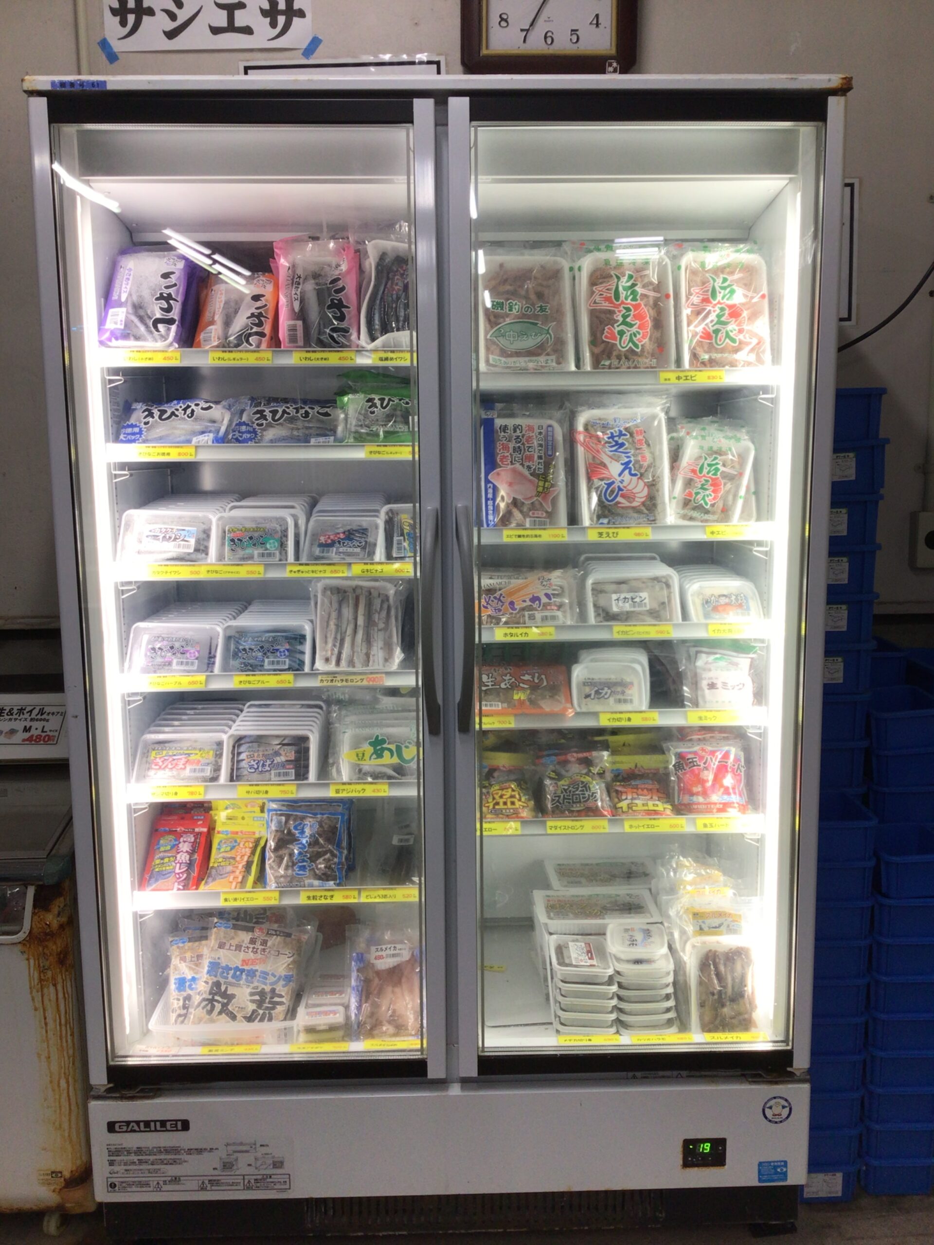 お隣にはイワシ きびなご サナギ エビ 練餌などがございます。当店ブログでも登場しております高級魚アマダイのエサ ホタルイカもご用意しております。どれを使えばいいかわからない時はスタッフまでお声かけください。