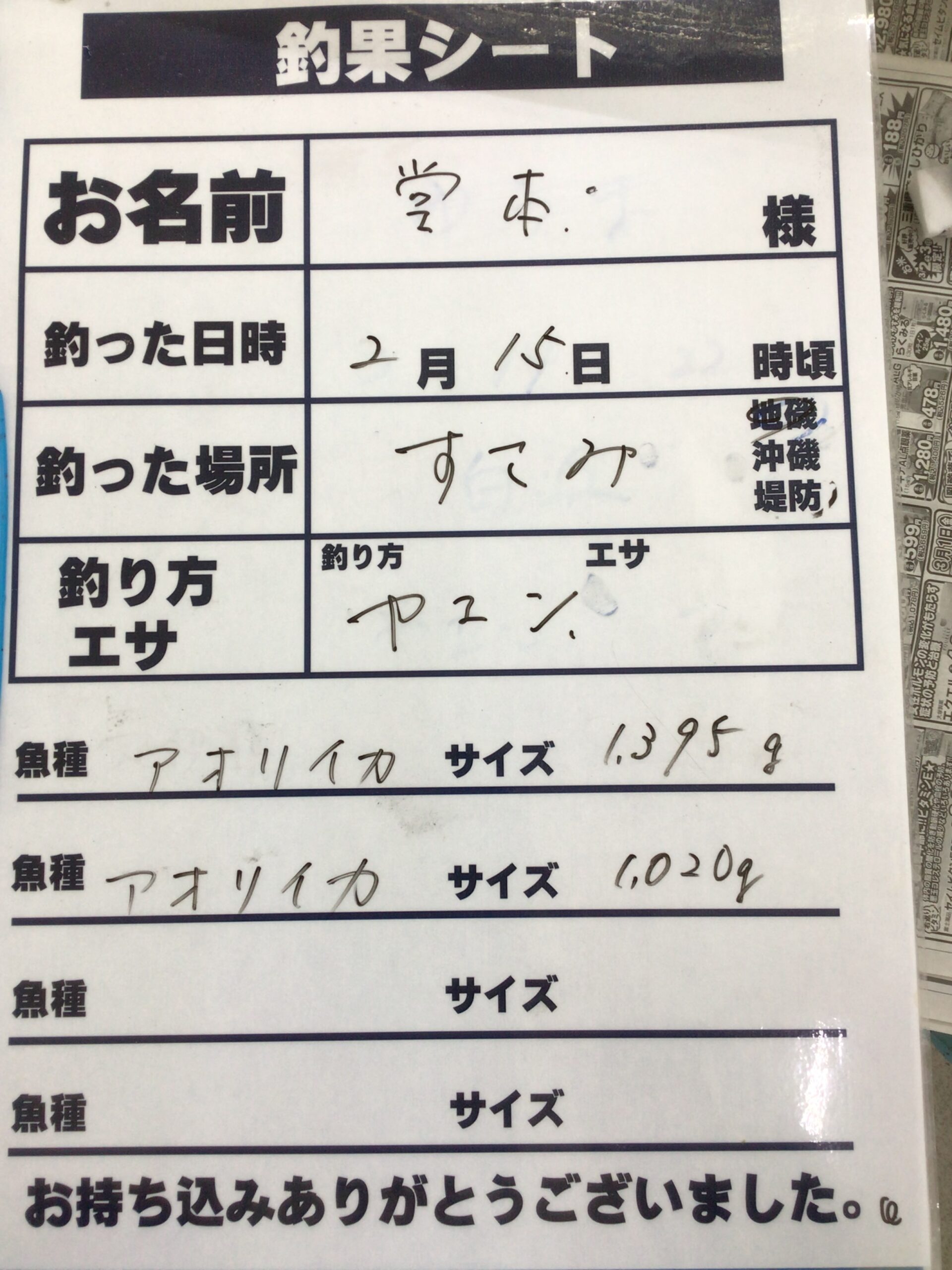 2/15すさみにてアオリイカ1.3kgと1kg ヤエン釣り釣果
