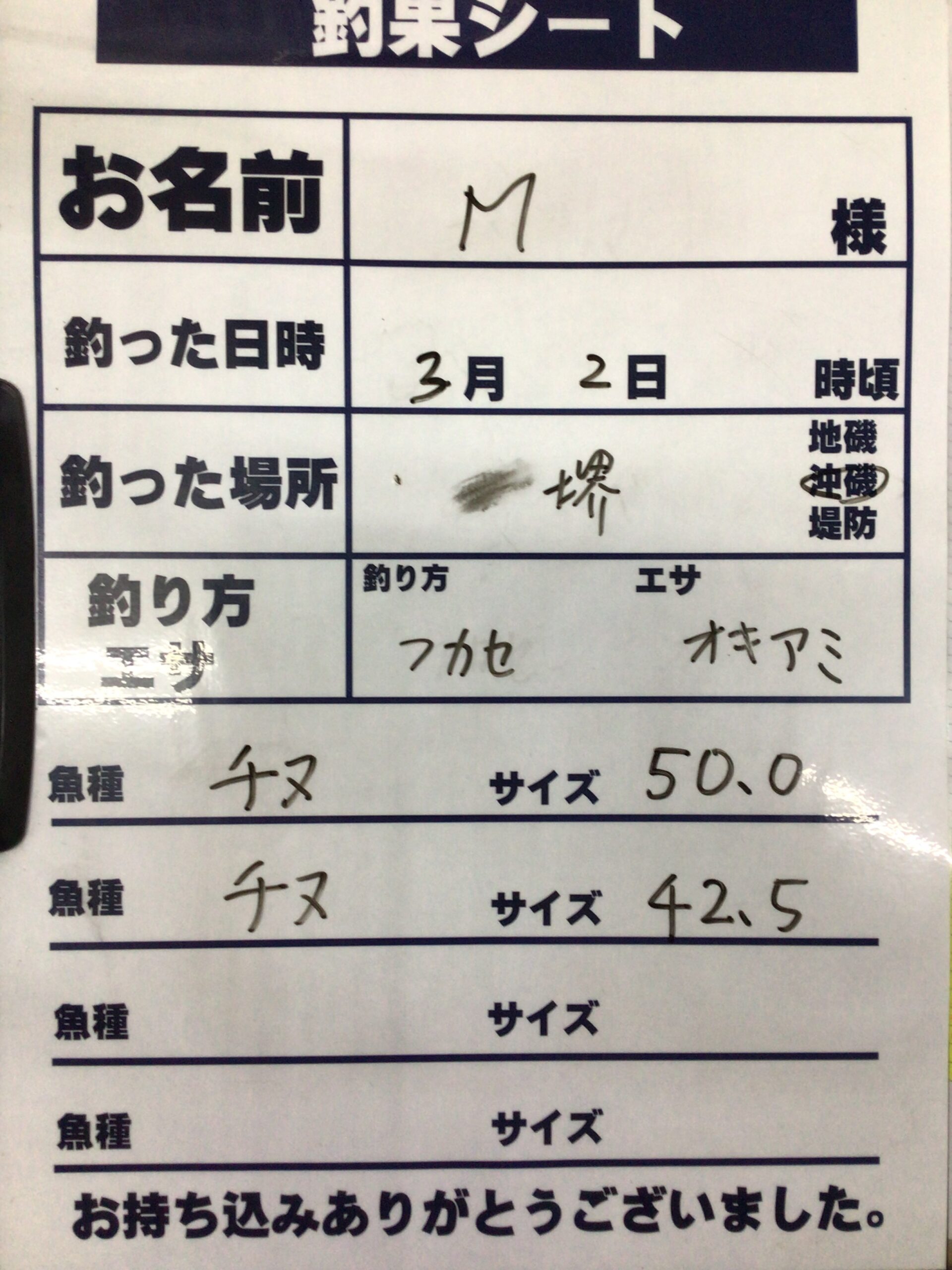 3/2堺沖磯にて年無しチヌ50cmの釣果 【☆50cm以上で1000円クーポン進呈】