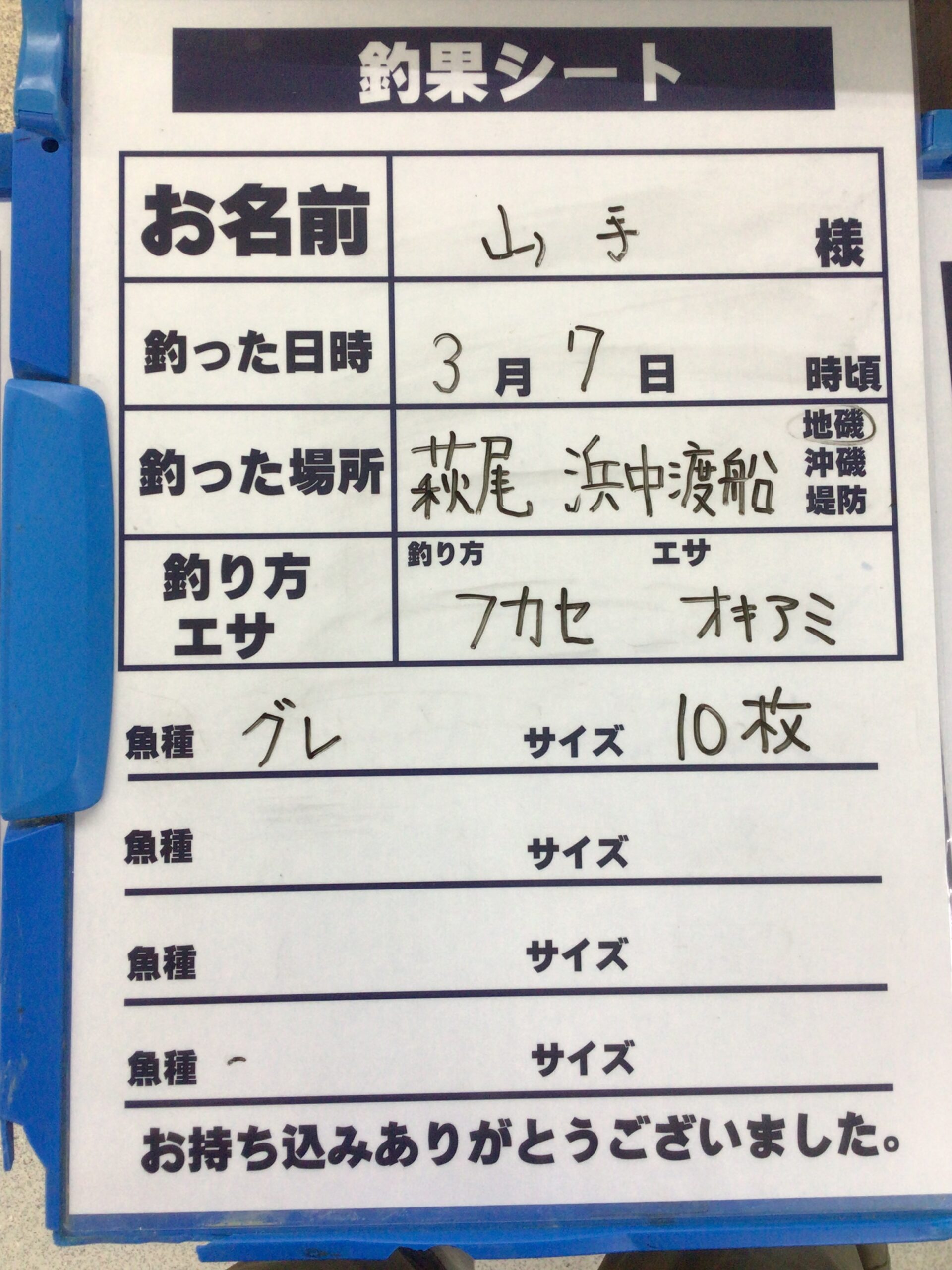 3/7大漁賞出ました!浜中渡船さんにてグレ30cm~ 10枚の釣果【★500円クーポン進呈】 グレ・チヌ、鯛系の釣果 2025.03.07 グレ30cm以上を10枚で500円クーポン進呈となります! お持ち込みありがとうございました。