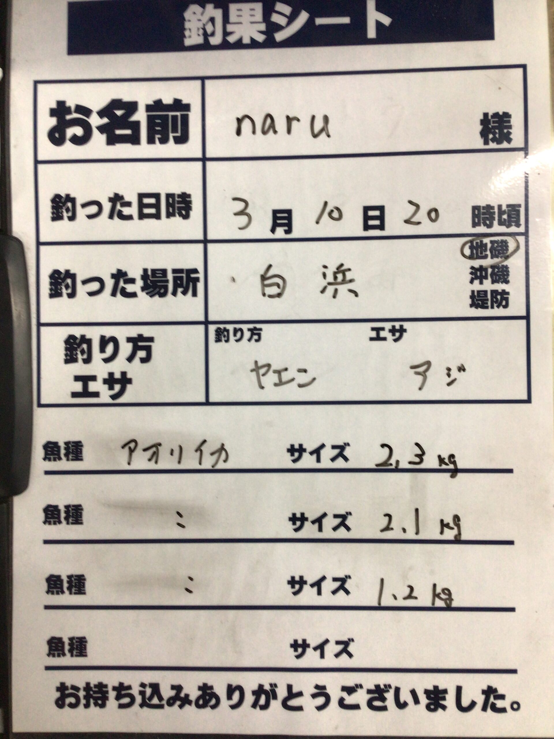 3/10(月)naru様 白浜地磯にてアオリイカ3杯の釣果