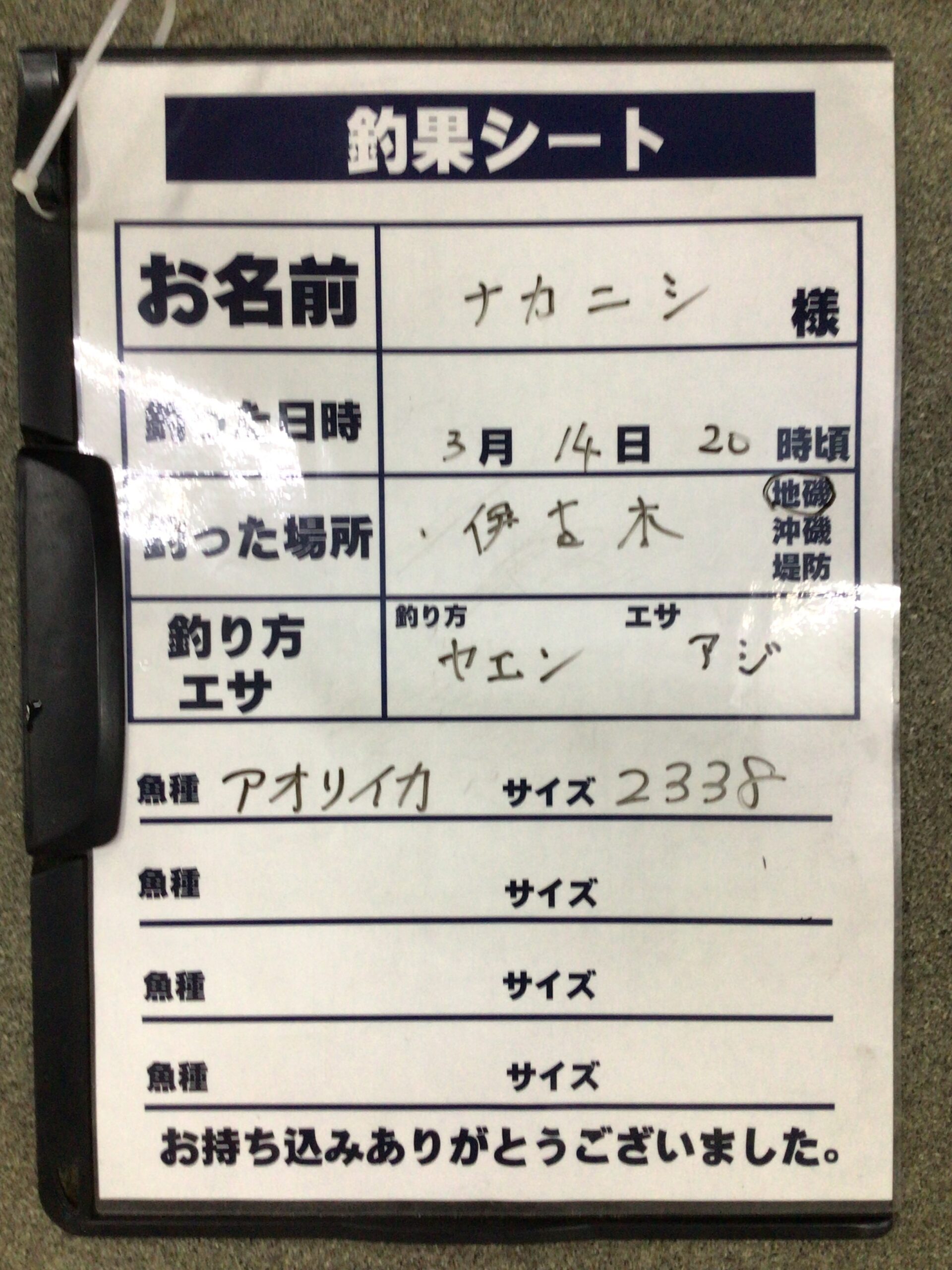 3月14日 ナカニシ様 アオリイカの釣果。2338g クーポン進呈。