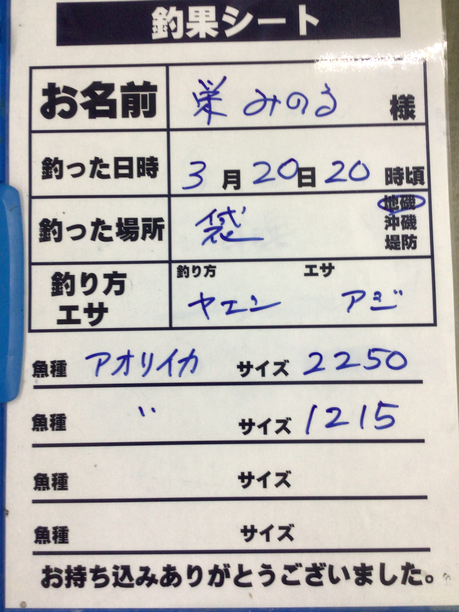 3月20日 栄みのる様 アオリイカの釣果。2250g