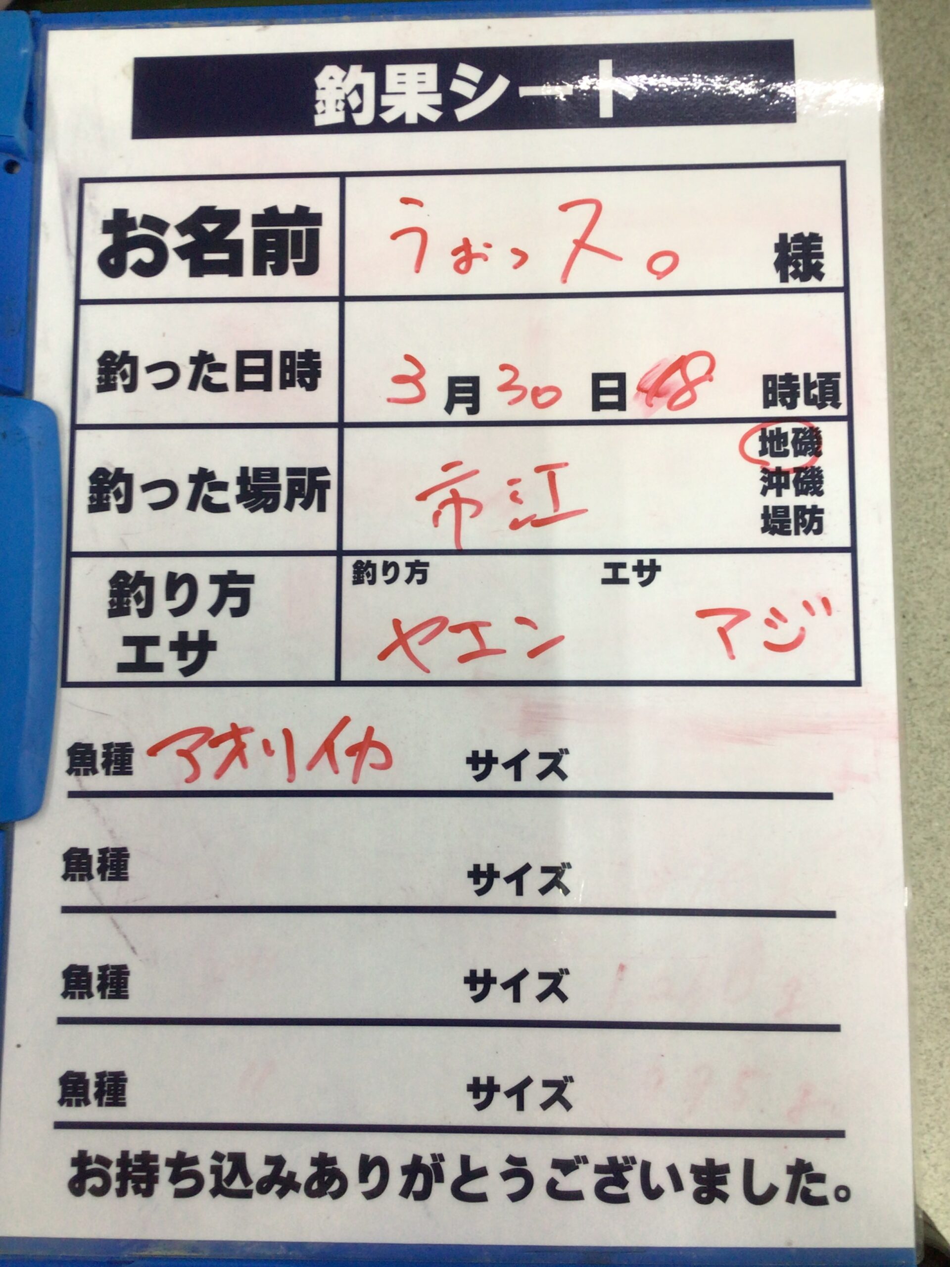 3/30 市江地磯にてアオリイカ2杯の持ち込み釣果