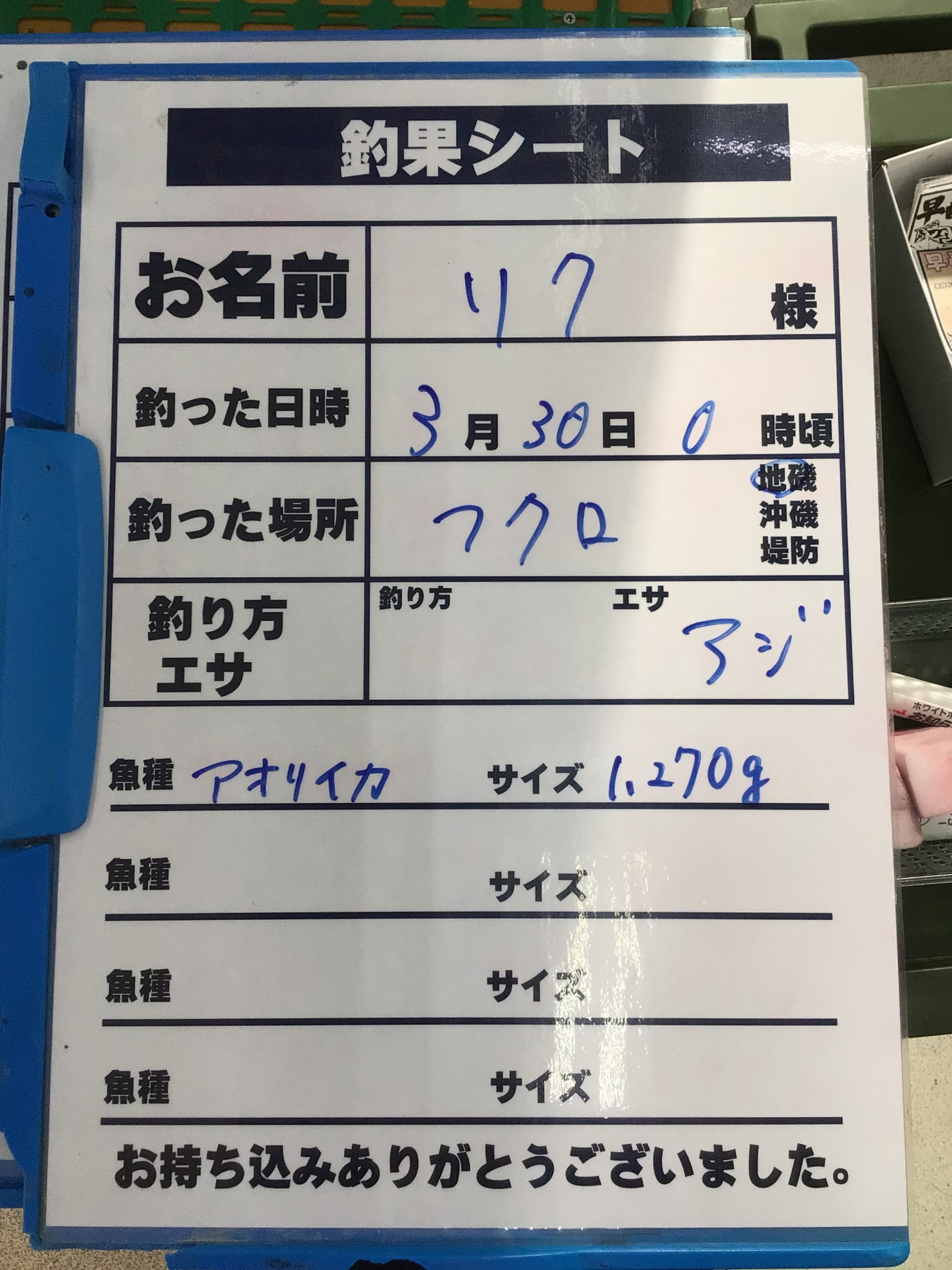 3/30 アオリイカの釣果 1270g 白浜町袋地磯、ヤエン釣りにて