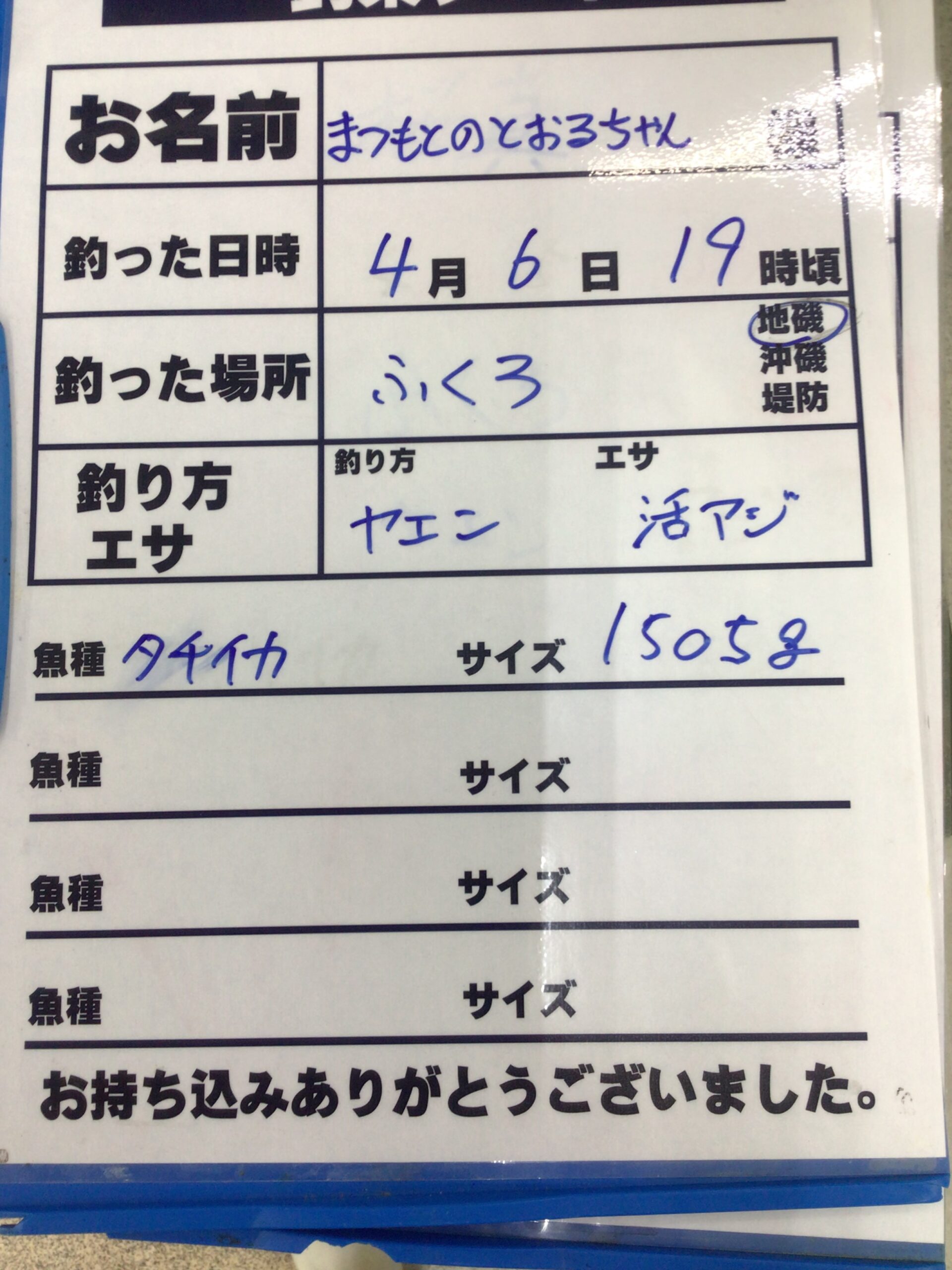 4/6(日) タチイカ釣果 1.505kg 袋にて ヤエン