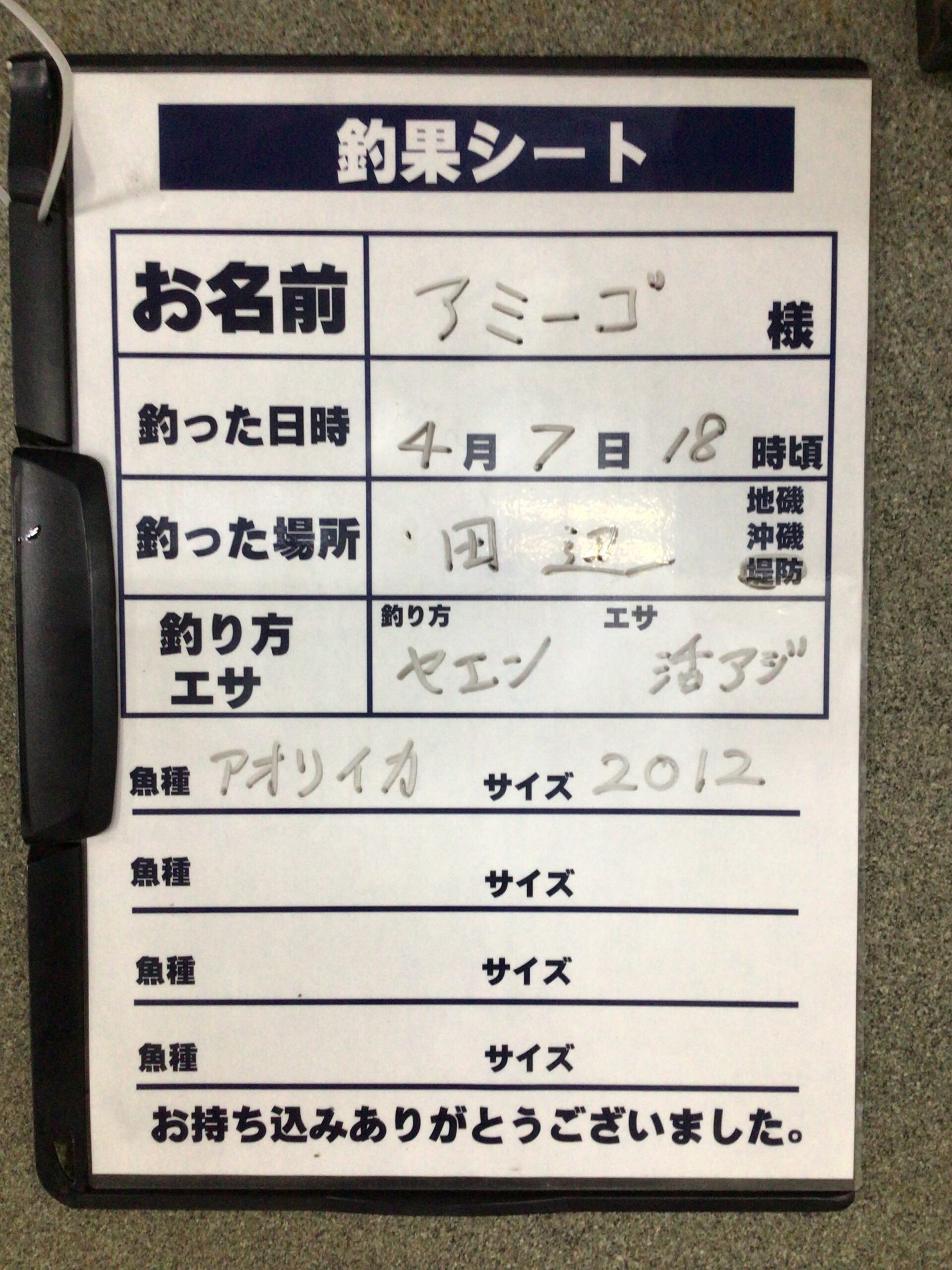 4月7日 アミーゴ様 アオリイカの釣果。2012g。