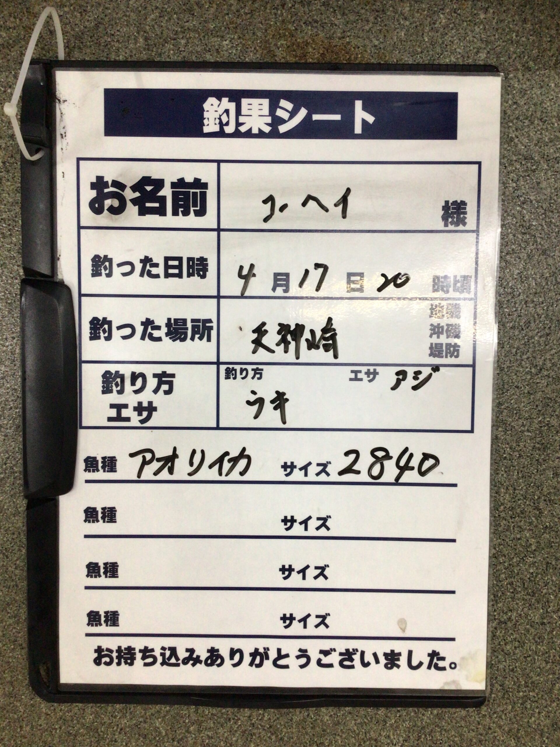 4月17日 コーヘイ様 アオリイカの釣果。2840g
