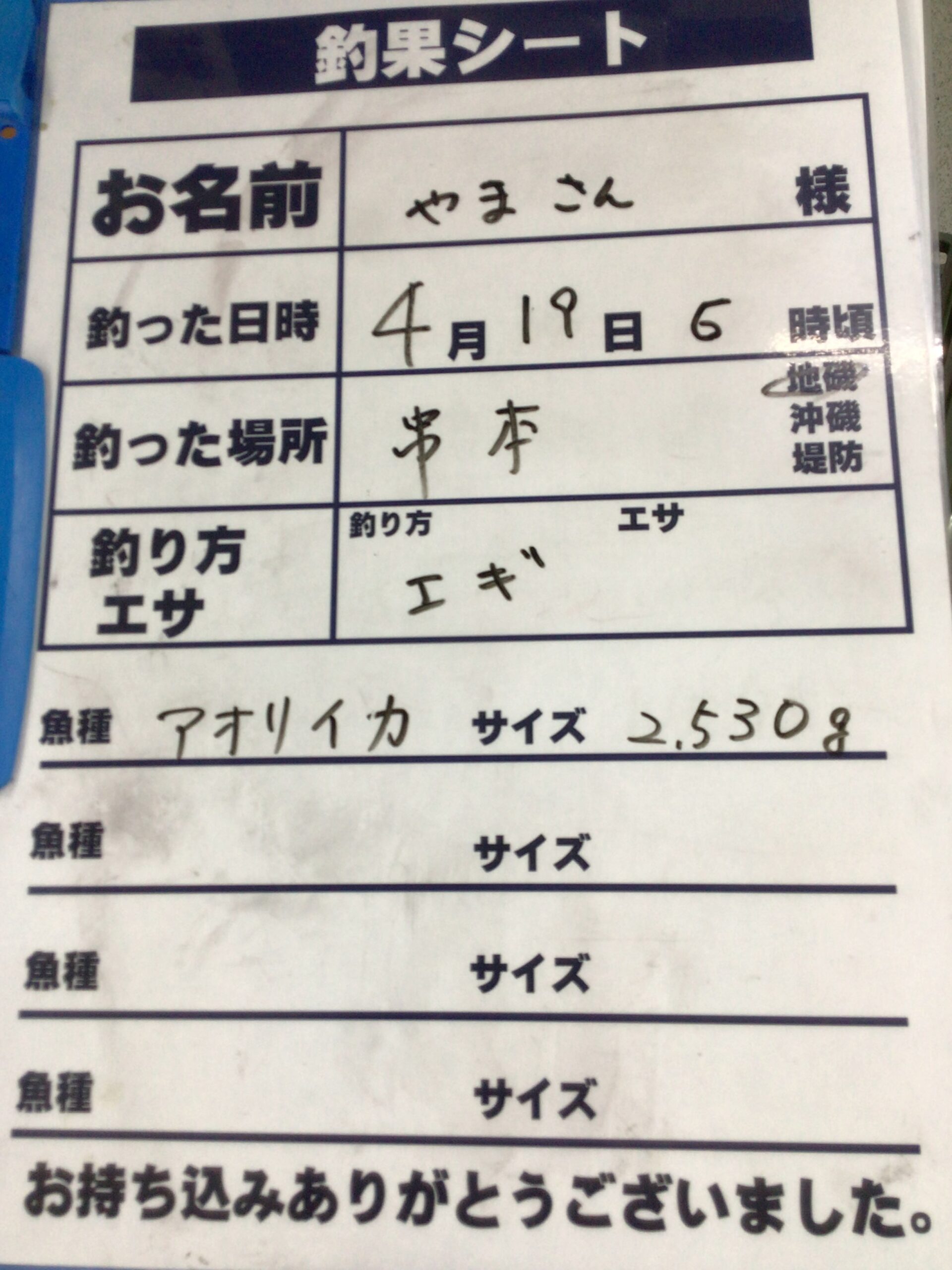 4/19 アオリイカの釣果 2515g 串本地磯、エギングにて