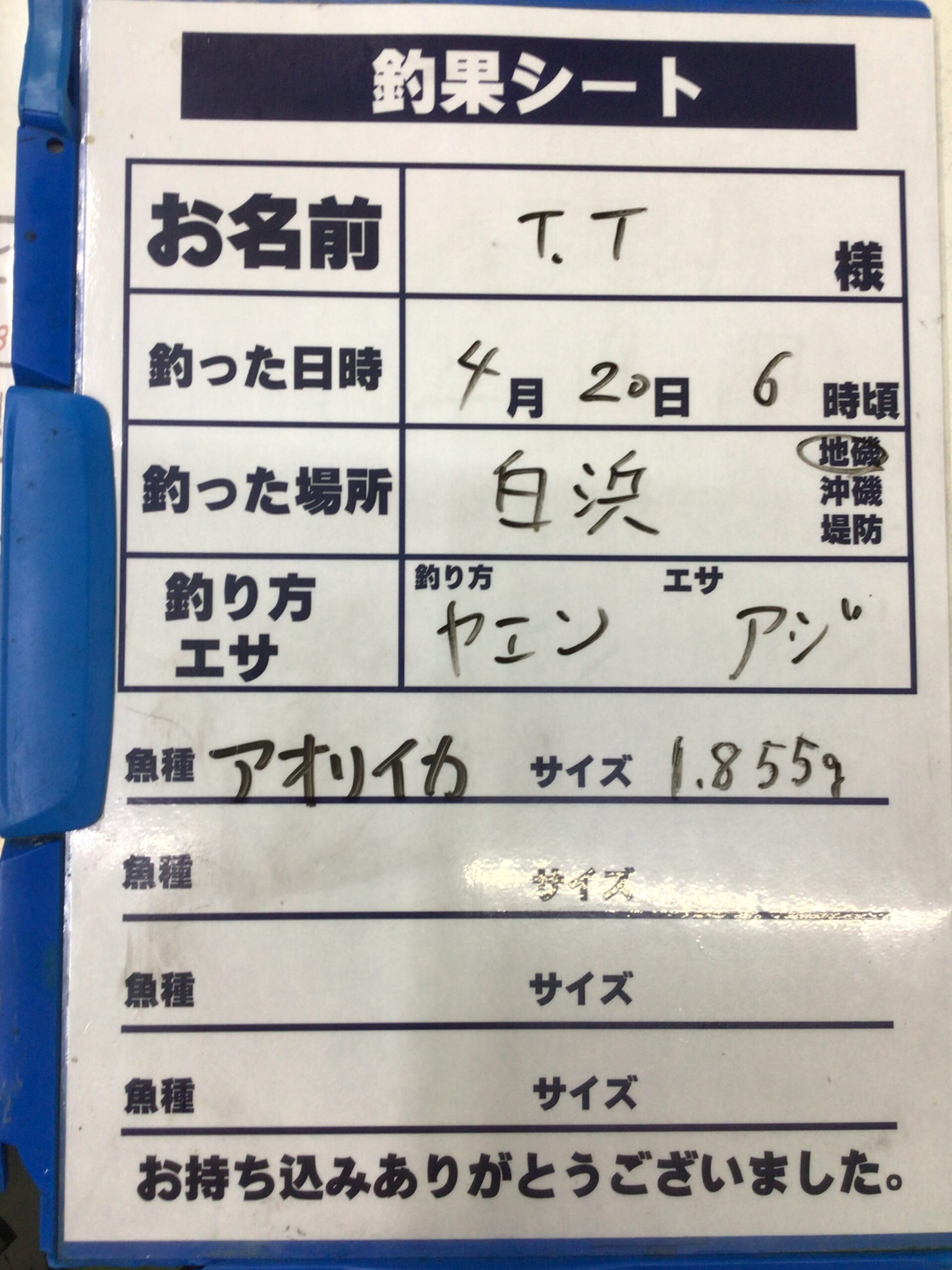 4/20 アオリイカの釣果 2220g 白浜見草、ヤエン釣りにて