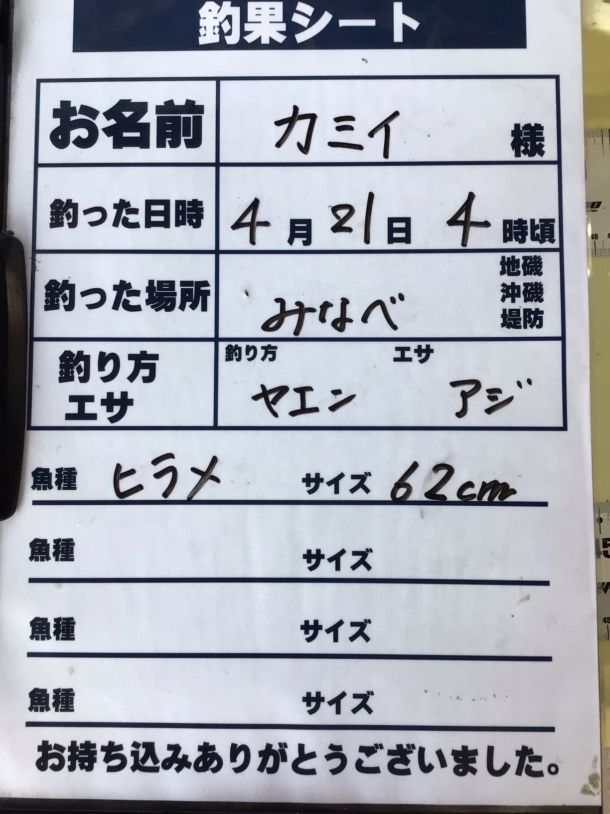 4/21 みなべでヒラメ62cm ヤエン釣り