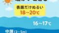 春の高気温で、水温が海面だけ暖かいということも多いが、表面何メートルまでぬくもっている?中層とどれくらい違いがある?