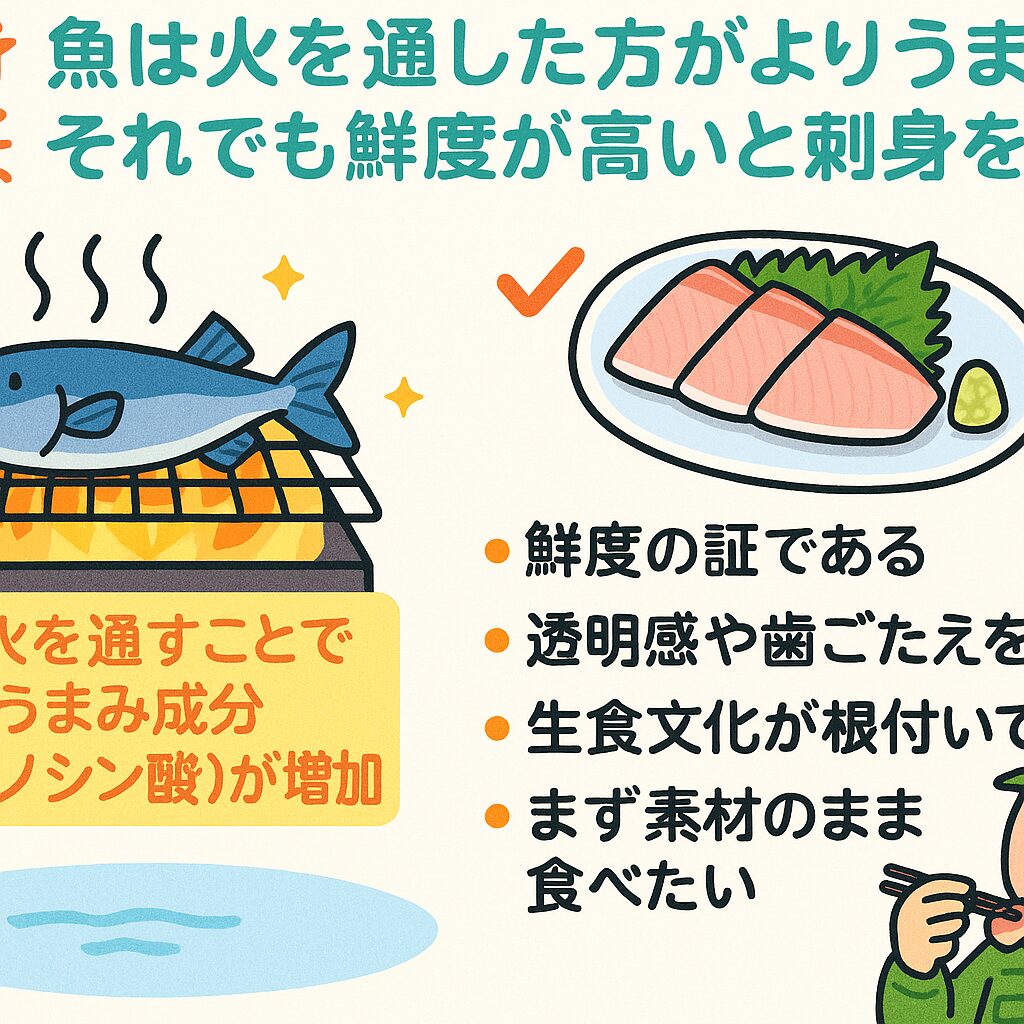 でも実は、魚の身に含まれる旨み成分(アミノ酸)は、火を通すことでより強く感じられることが科学的に証明されています。